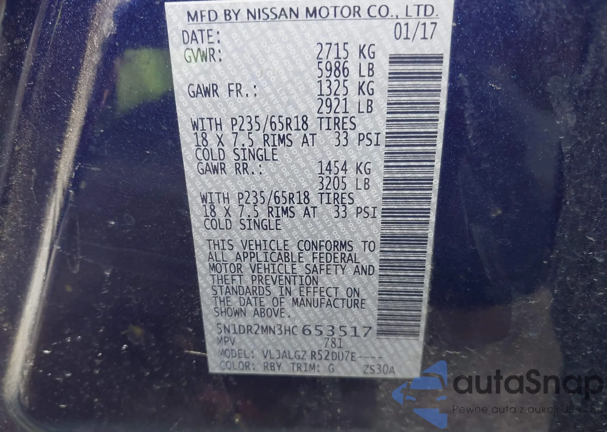 LOT: 44024537 VIN: 5N1DR2MN3HC653517