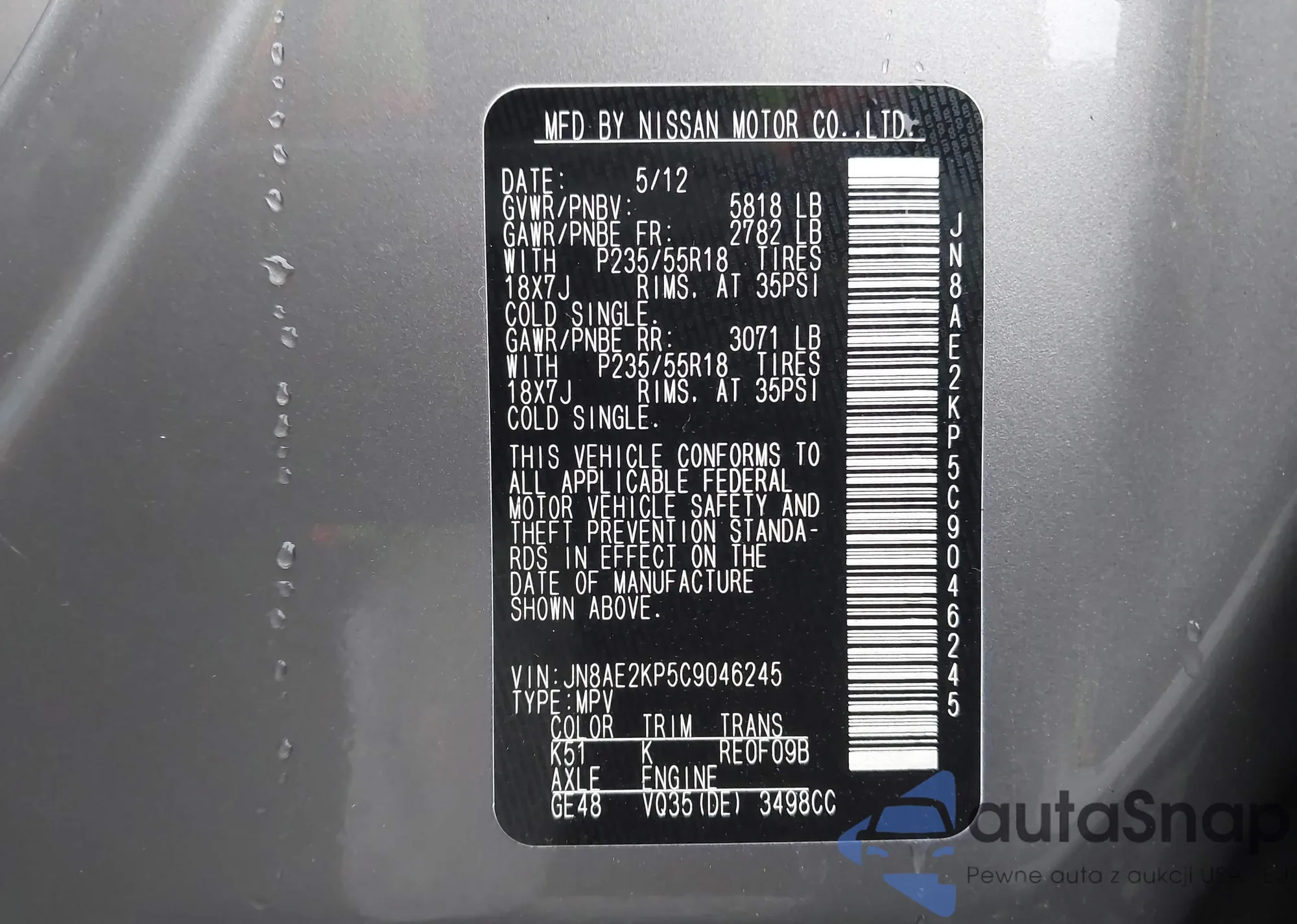 LOT: 43785486 VIN: JN8AE2KP5C9046245