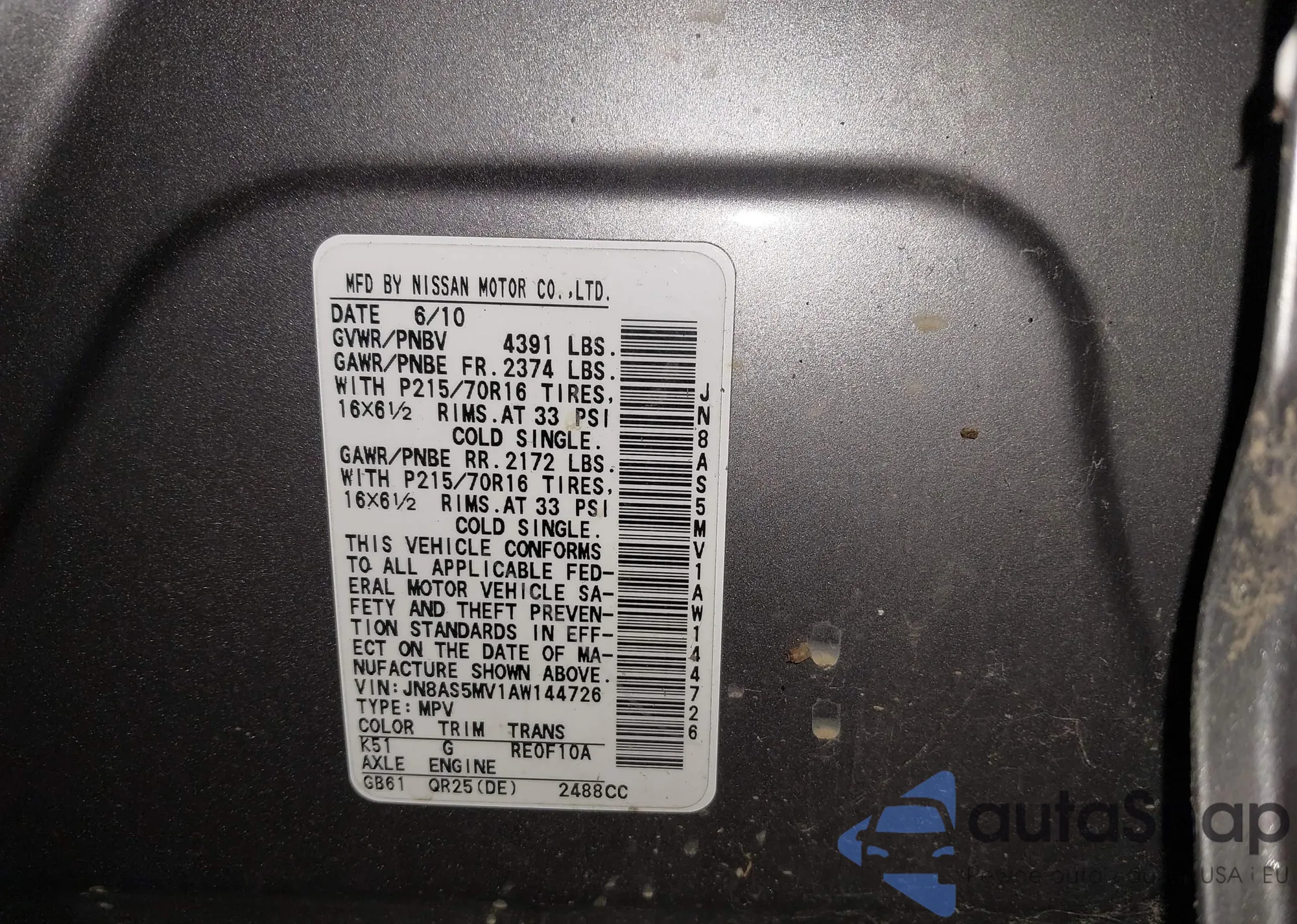 • VIN JN8AS5MV1AW144726