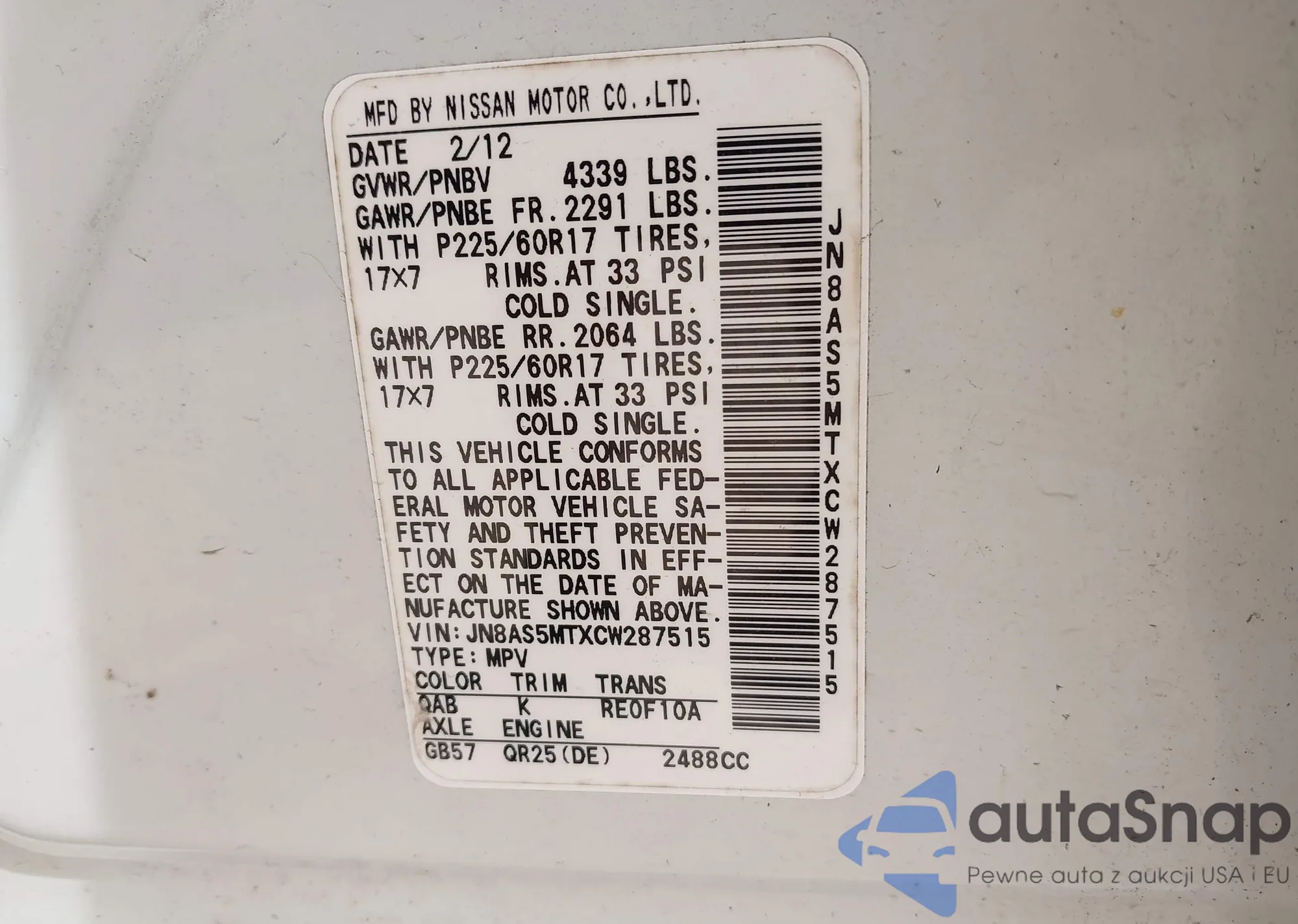 LOT: 40253689 VIN: JN8AS5MTXCW287515