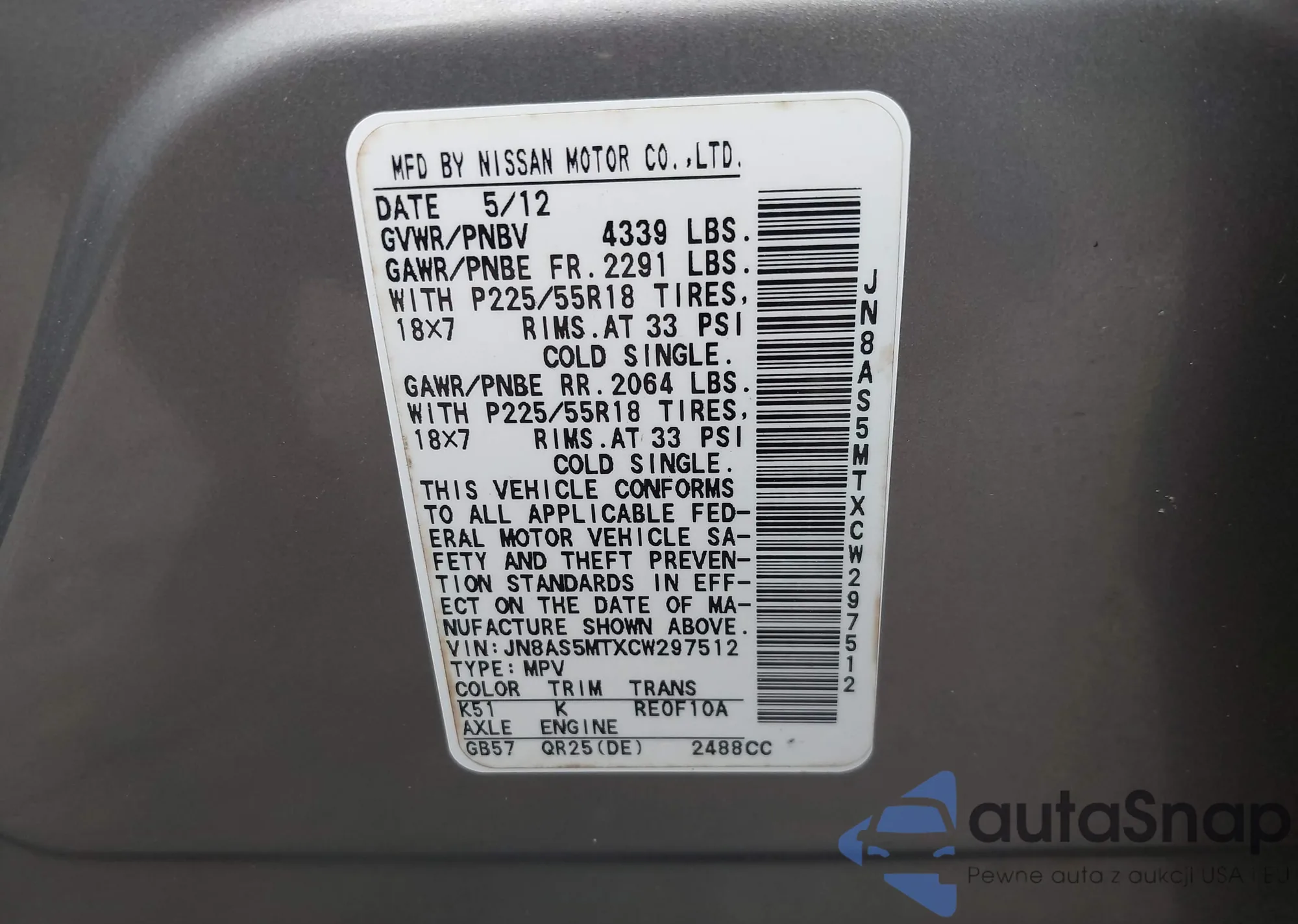 LOT: 40287230 VIN: JN8AS5MTXCW297512
