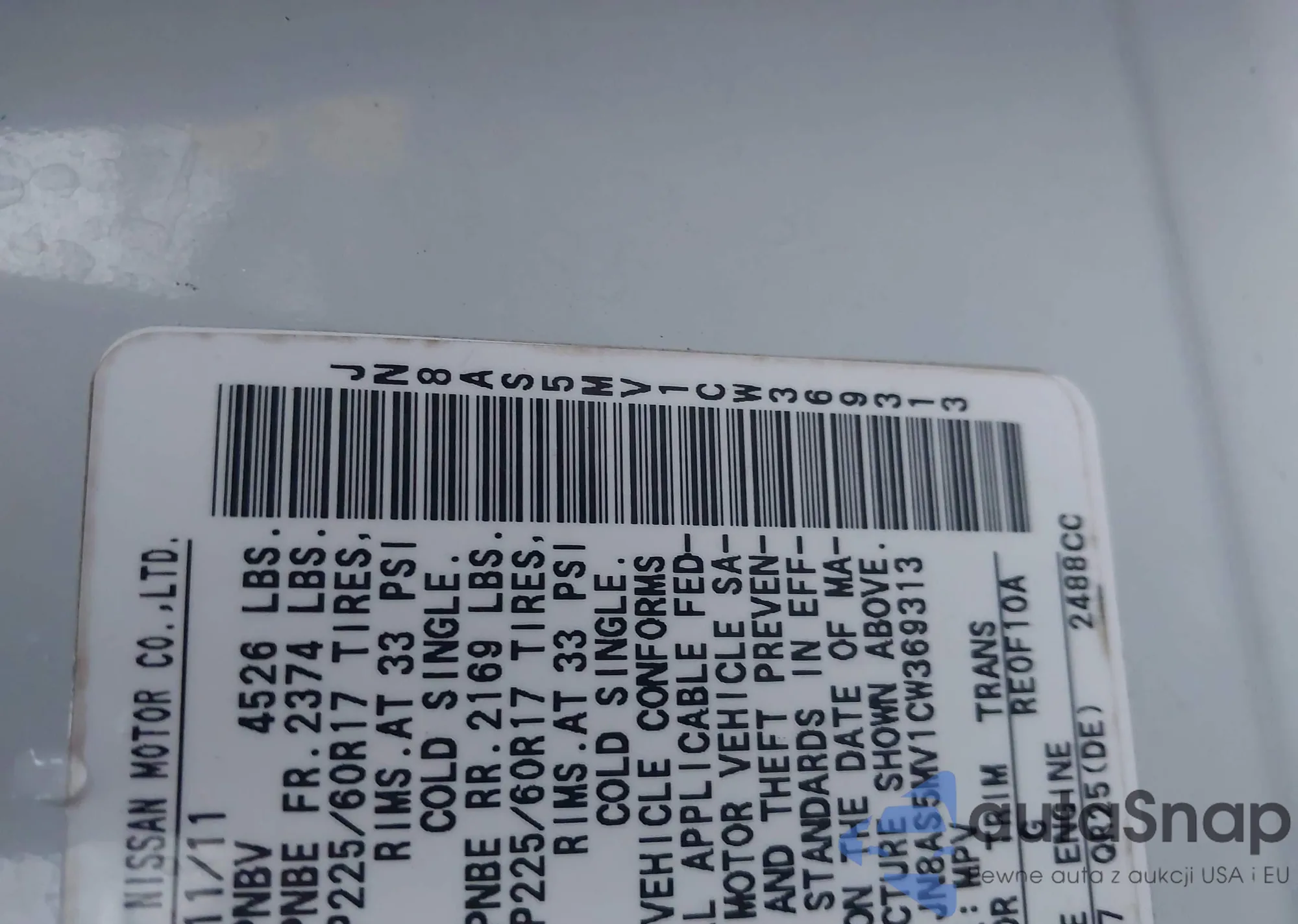 • VIN JN8AS5MV1CW369313