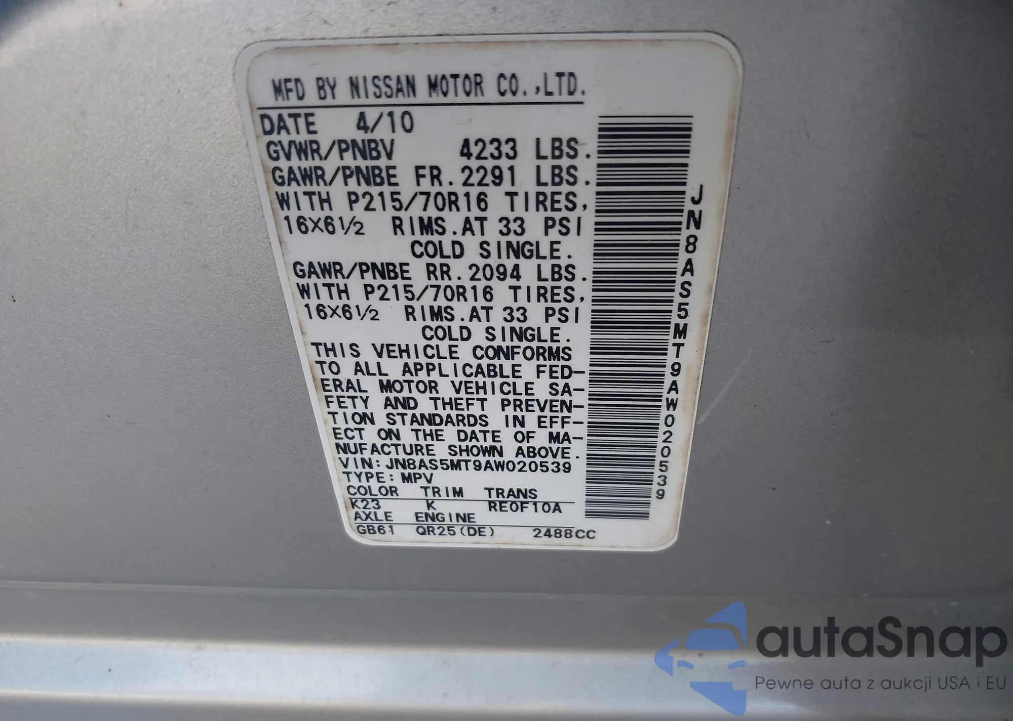• VIN JN8AS5MT9AW020539