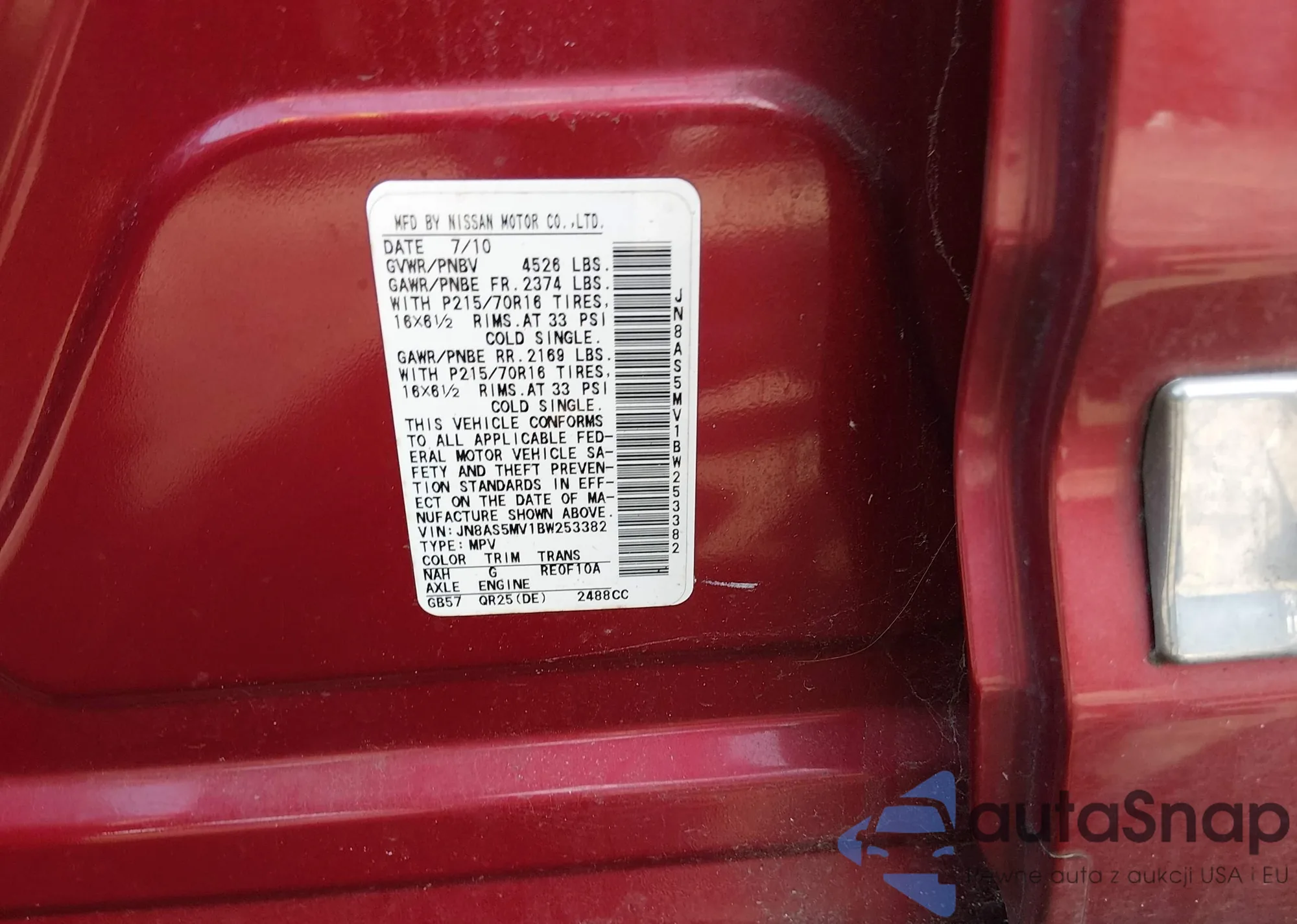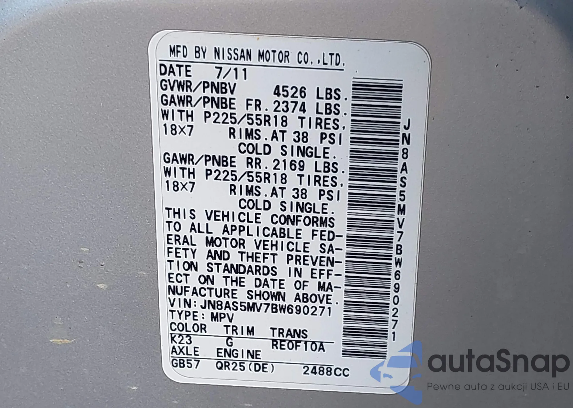 • VIN JN8AS5MV7BW690271