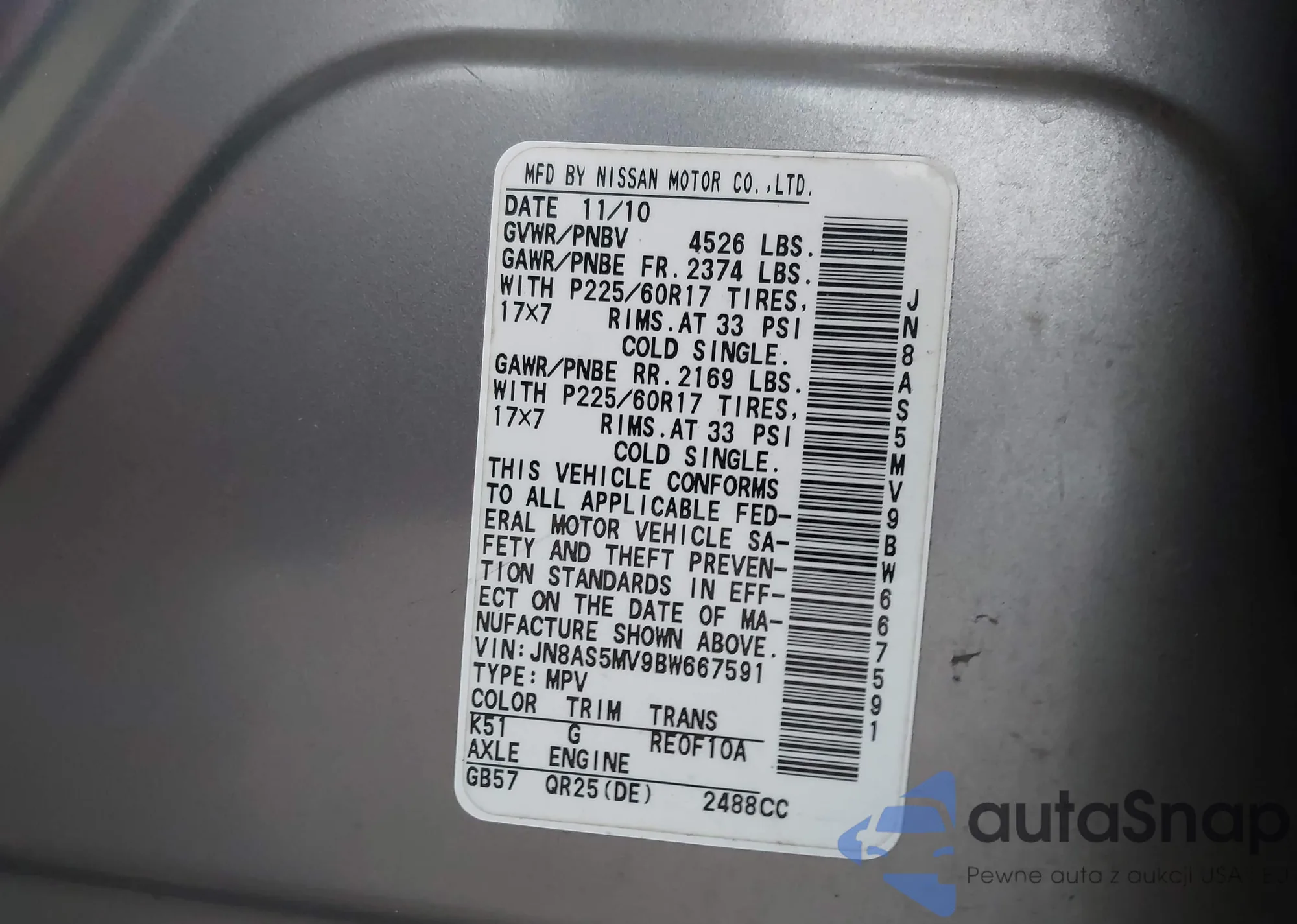 • VIN JN8AS5MV9BW667591