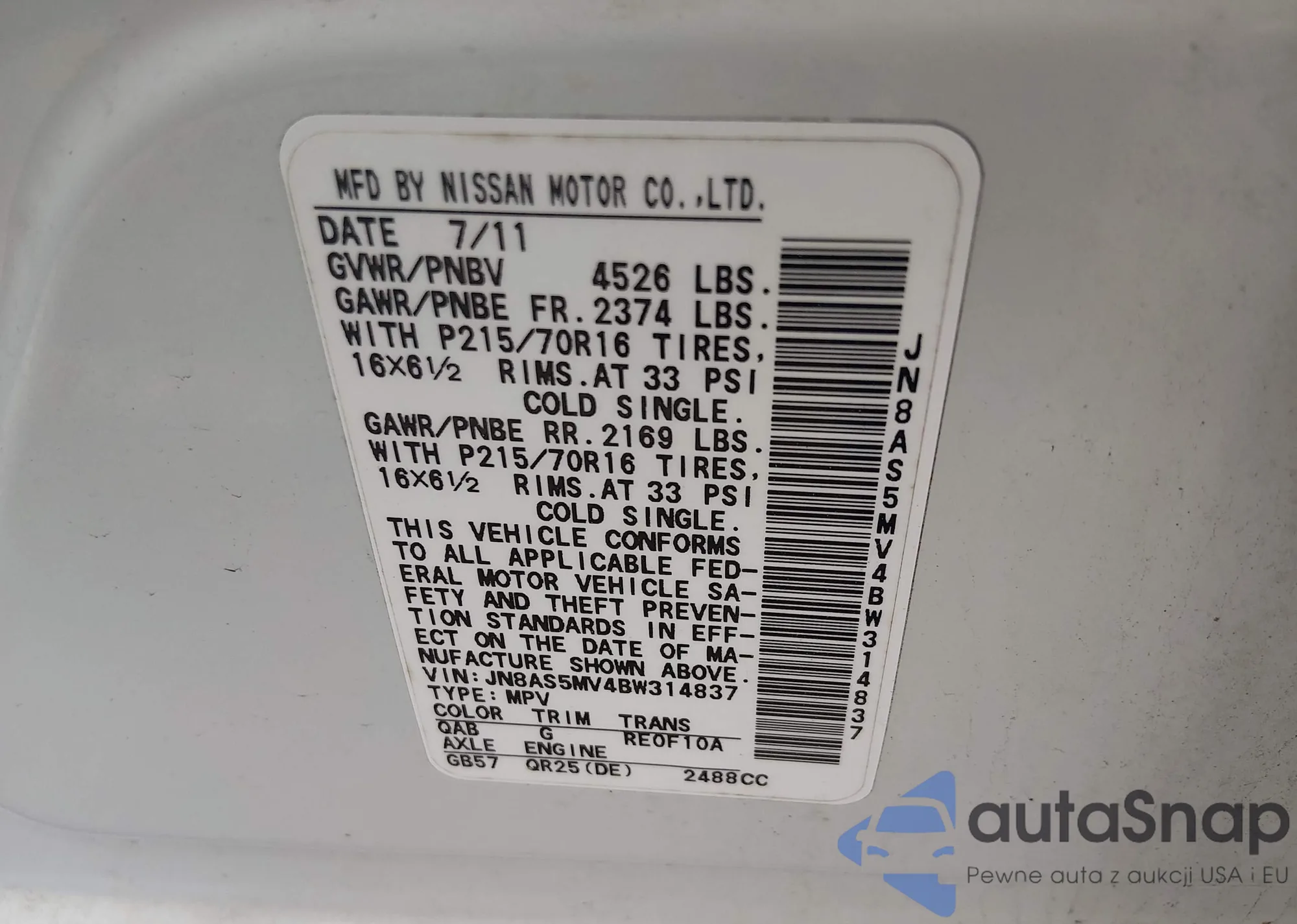 • VIN JN8AS5MV4BW314837