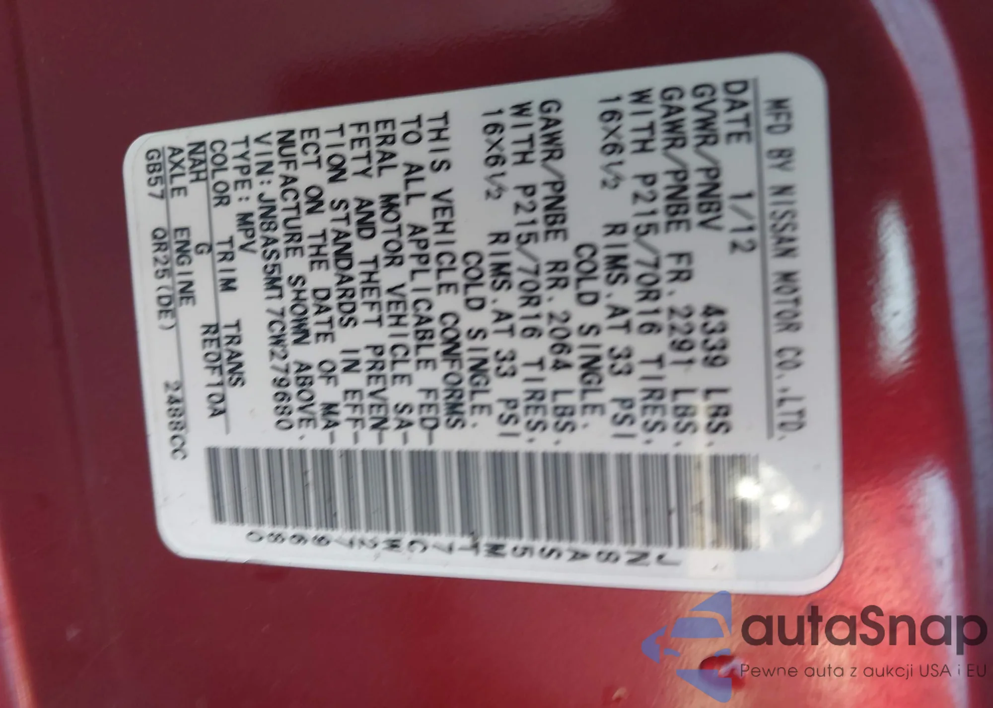 • VIN JN8AS5MT7CW279680