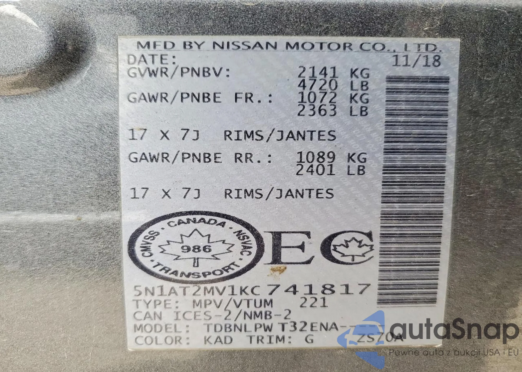 LOT: 79454605 VIN: JN8AT2MT6HW132298