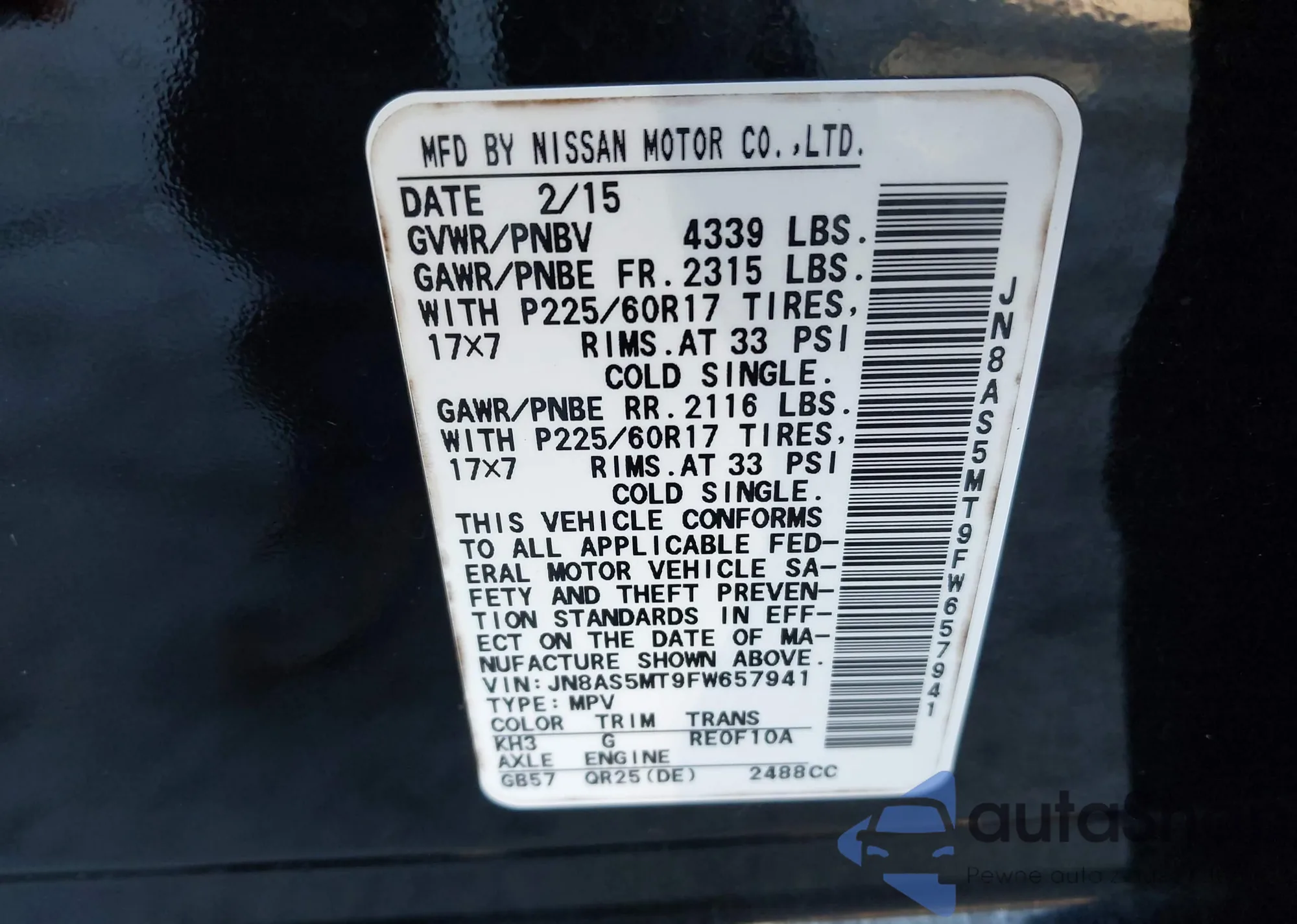 LOT: 44065233 VIN: JN8AS5MT9FW657941