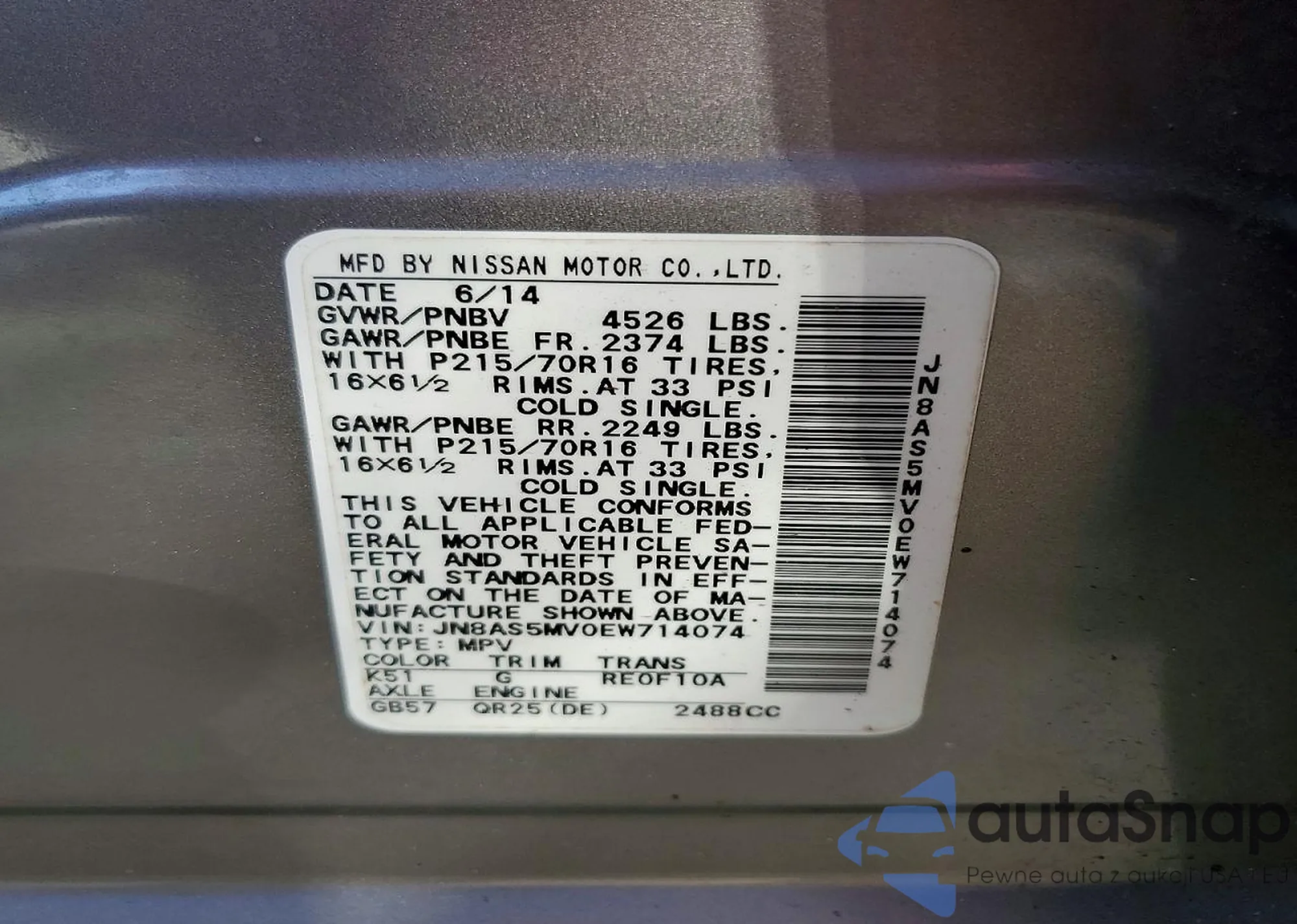LOT: 72441475 VIN: JN8AS5MV0EW714074