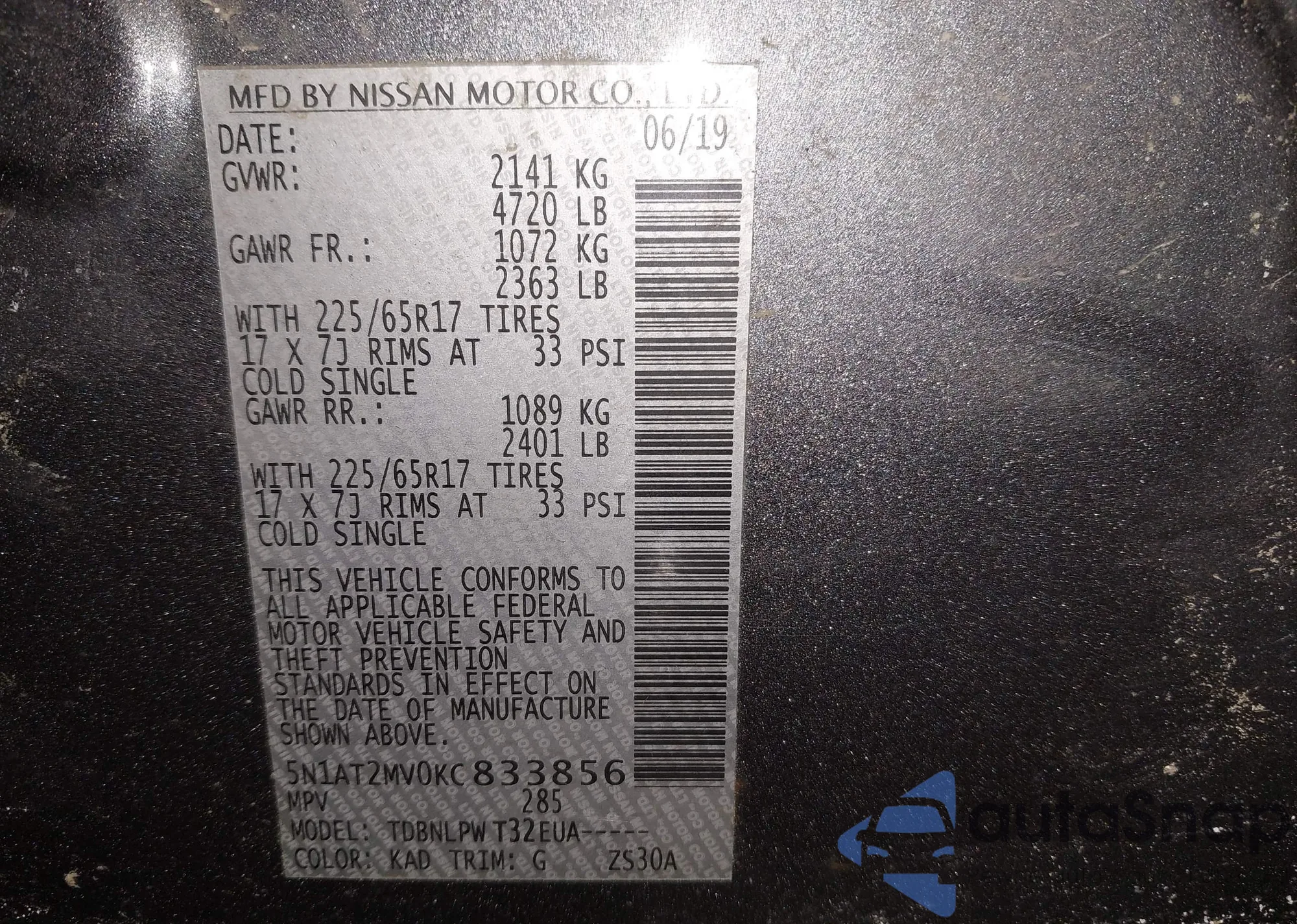 • VIN 5N1AT2MV0KC833856