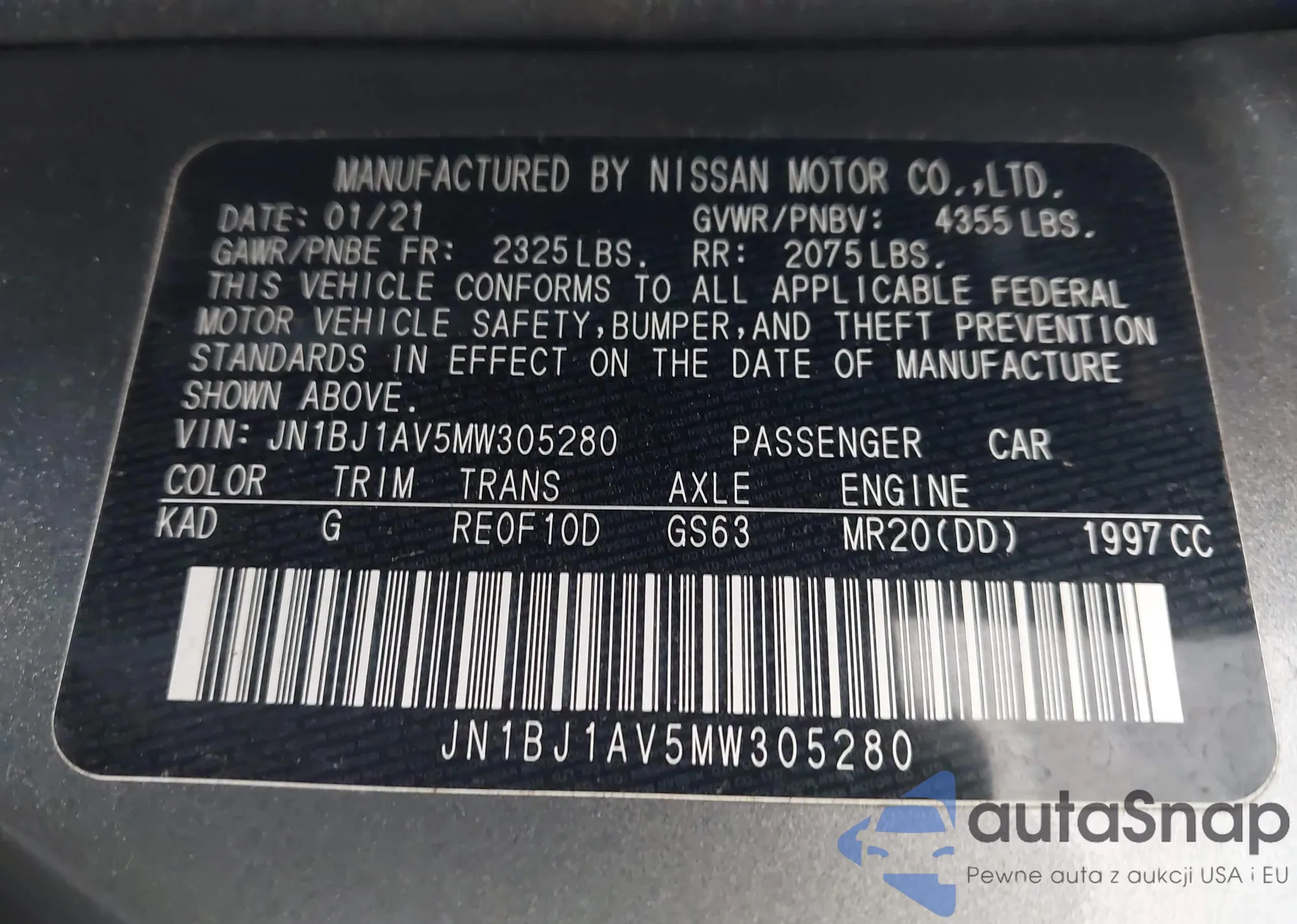 LOT: 44313873 VIN: JN1BJ1AV5MW305280