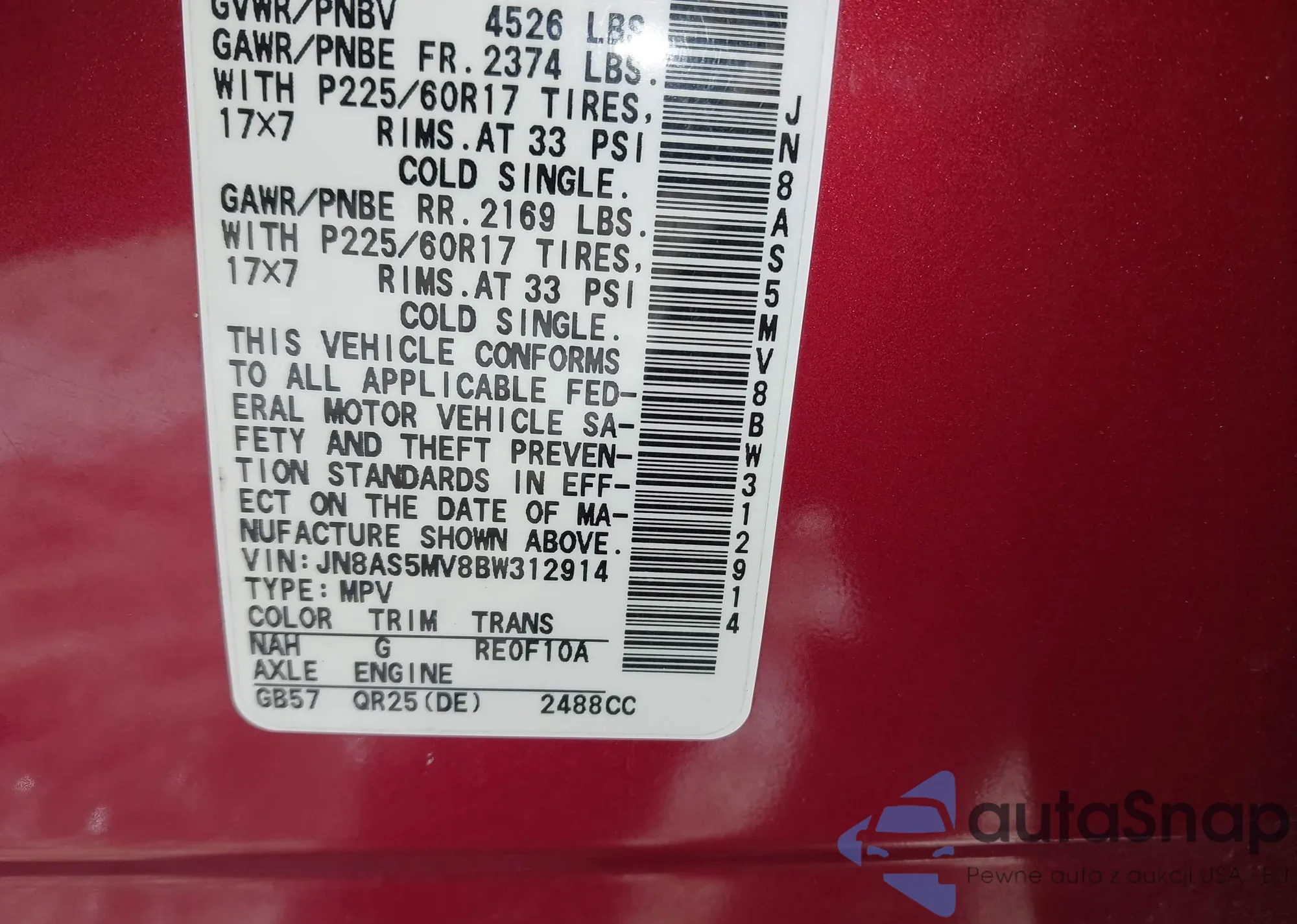 • VIN JN8AS5MV8BW312914
