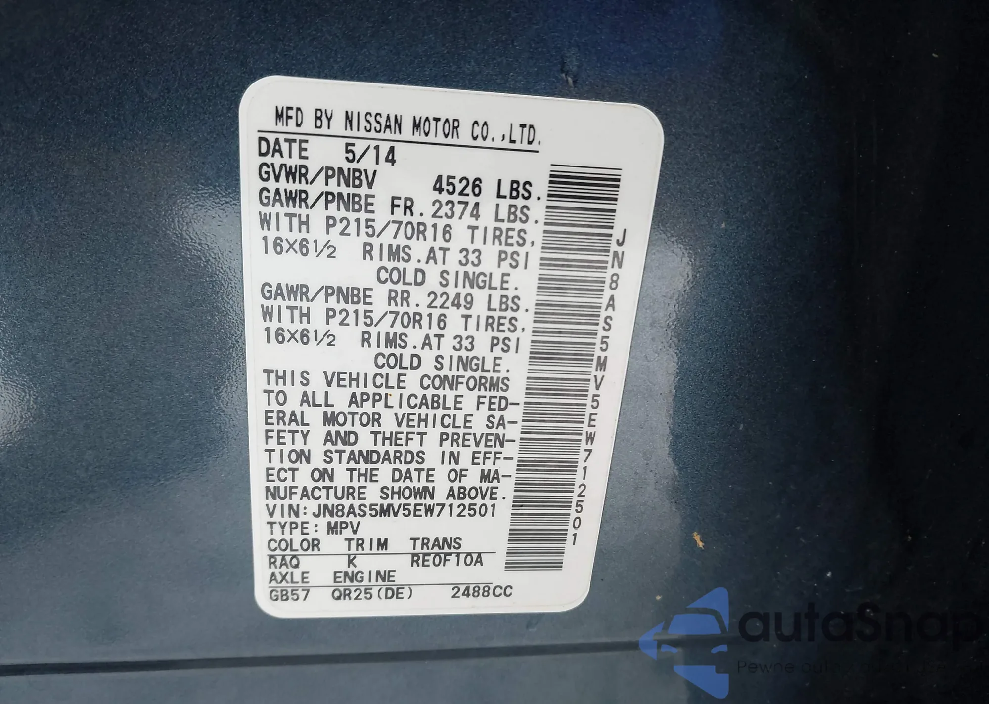 • VIN JN8AS5MV5EW712501