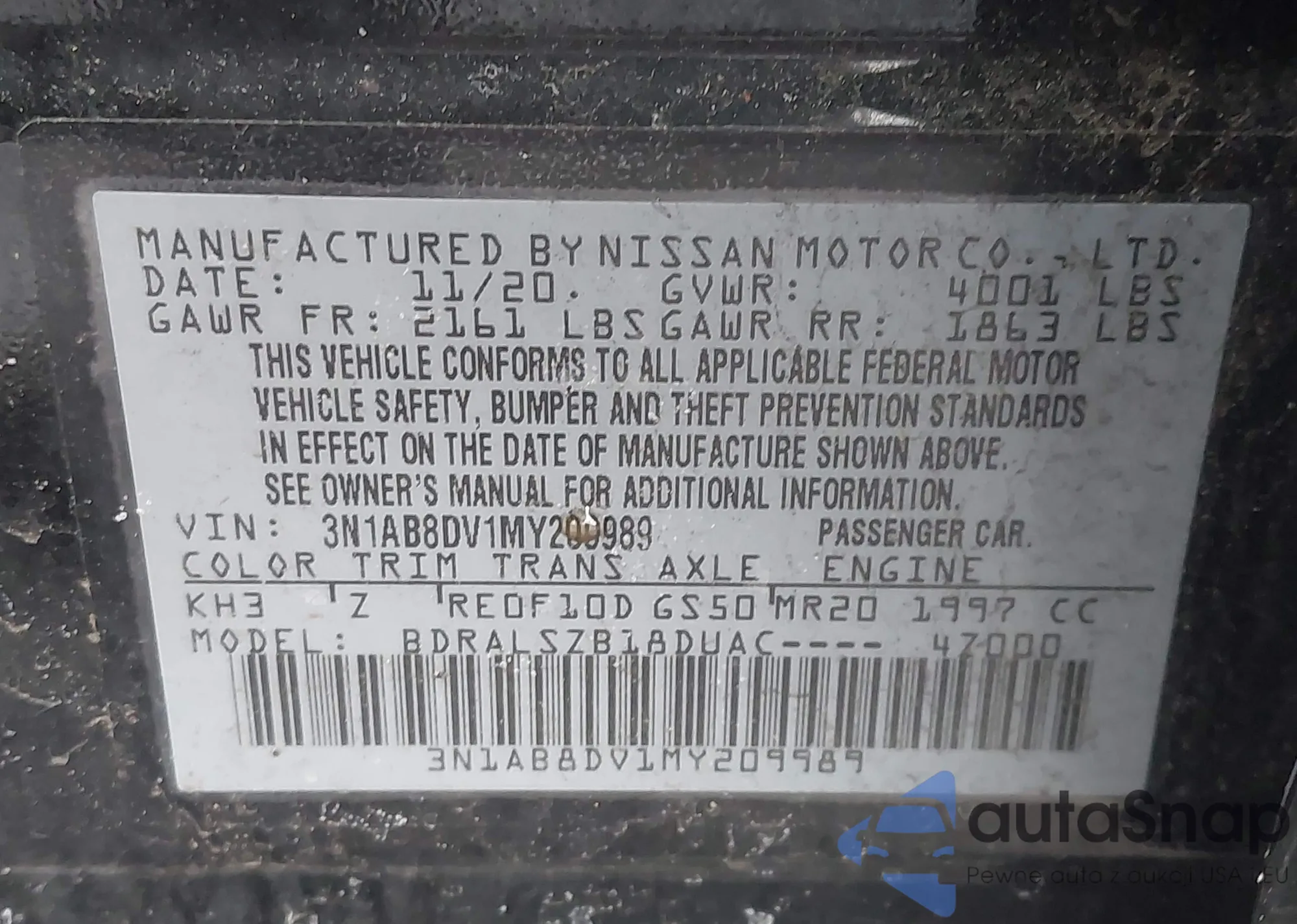 • VIN 3N1AB8DV1MY209989