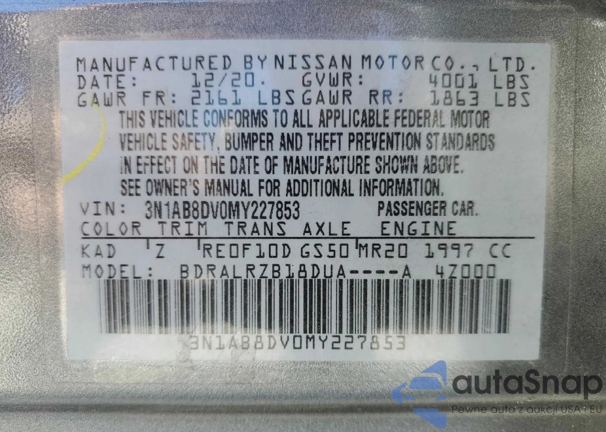 • VIN 3N1AB8DV0MY227853