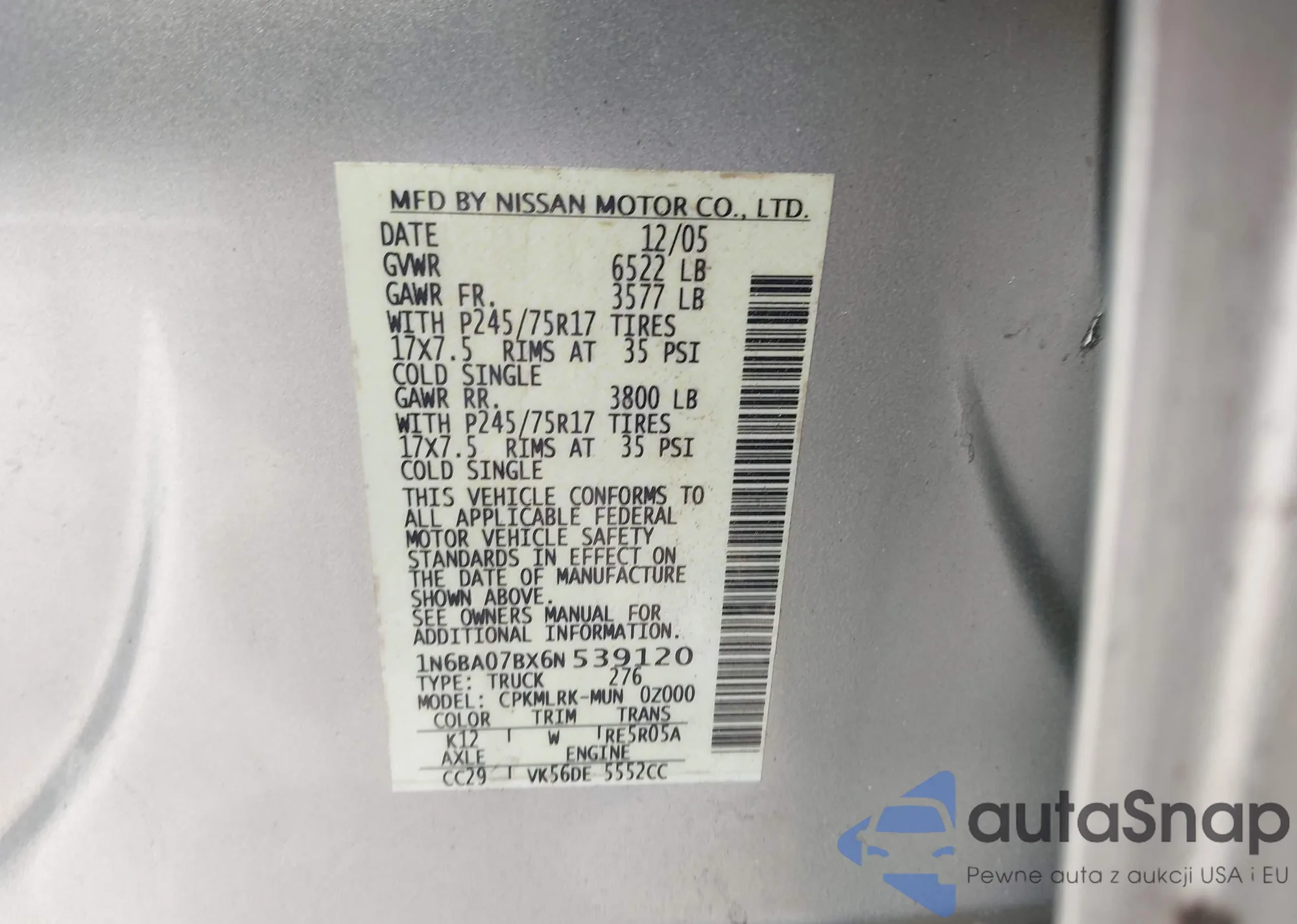 • VIN 1N6BA07BX6N539120