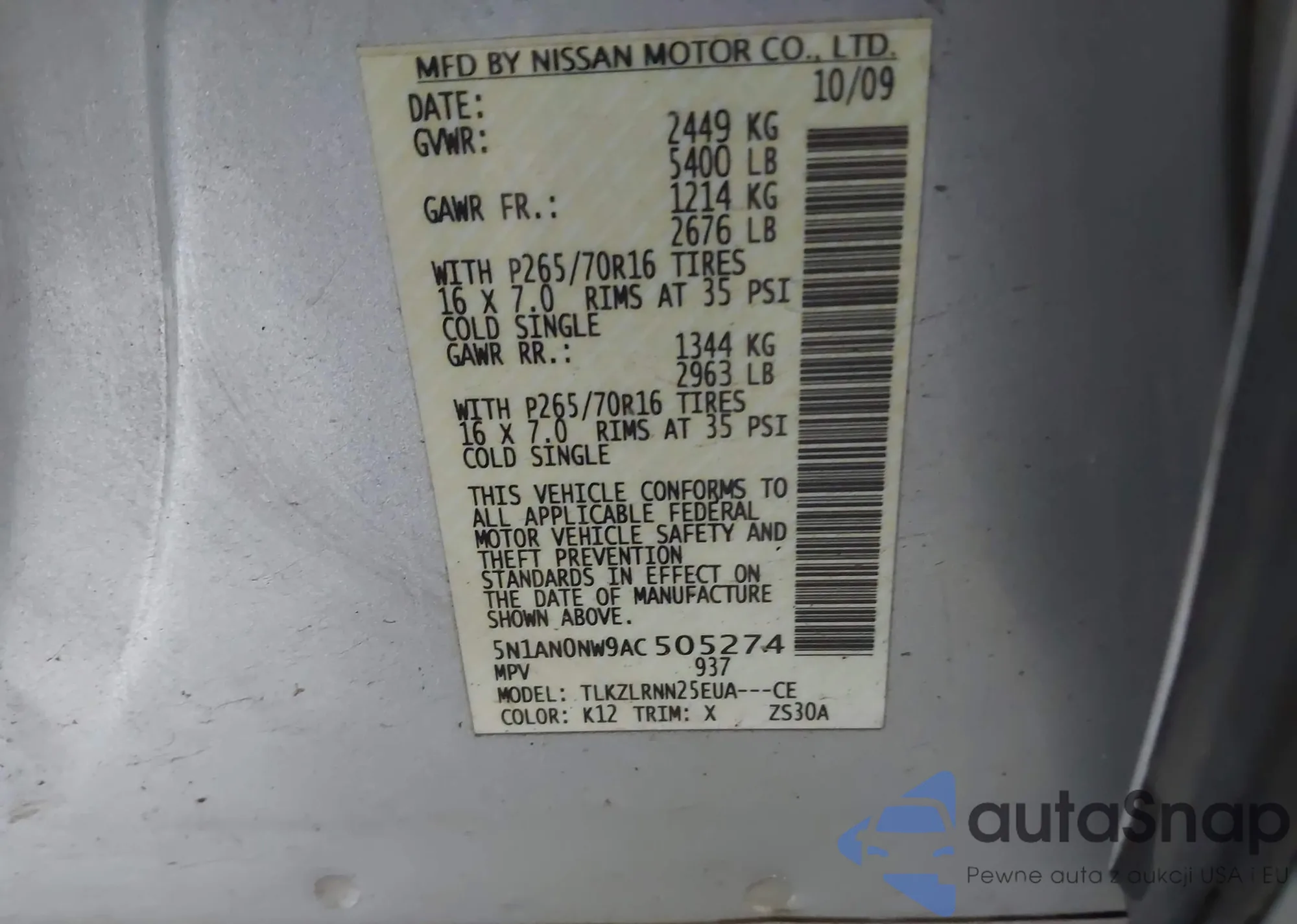 • VIN 5N1AN0NW9AC505274