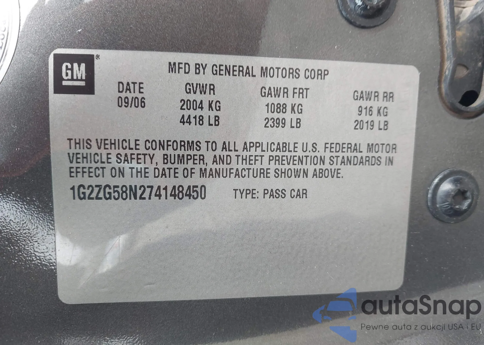 LOT: 44333853 VIN: 1G2ZG58N274148450
