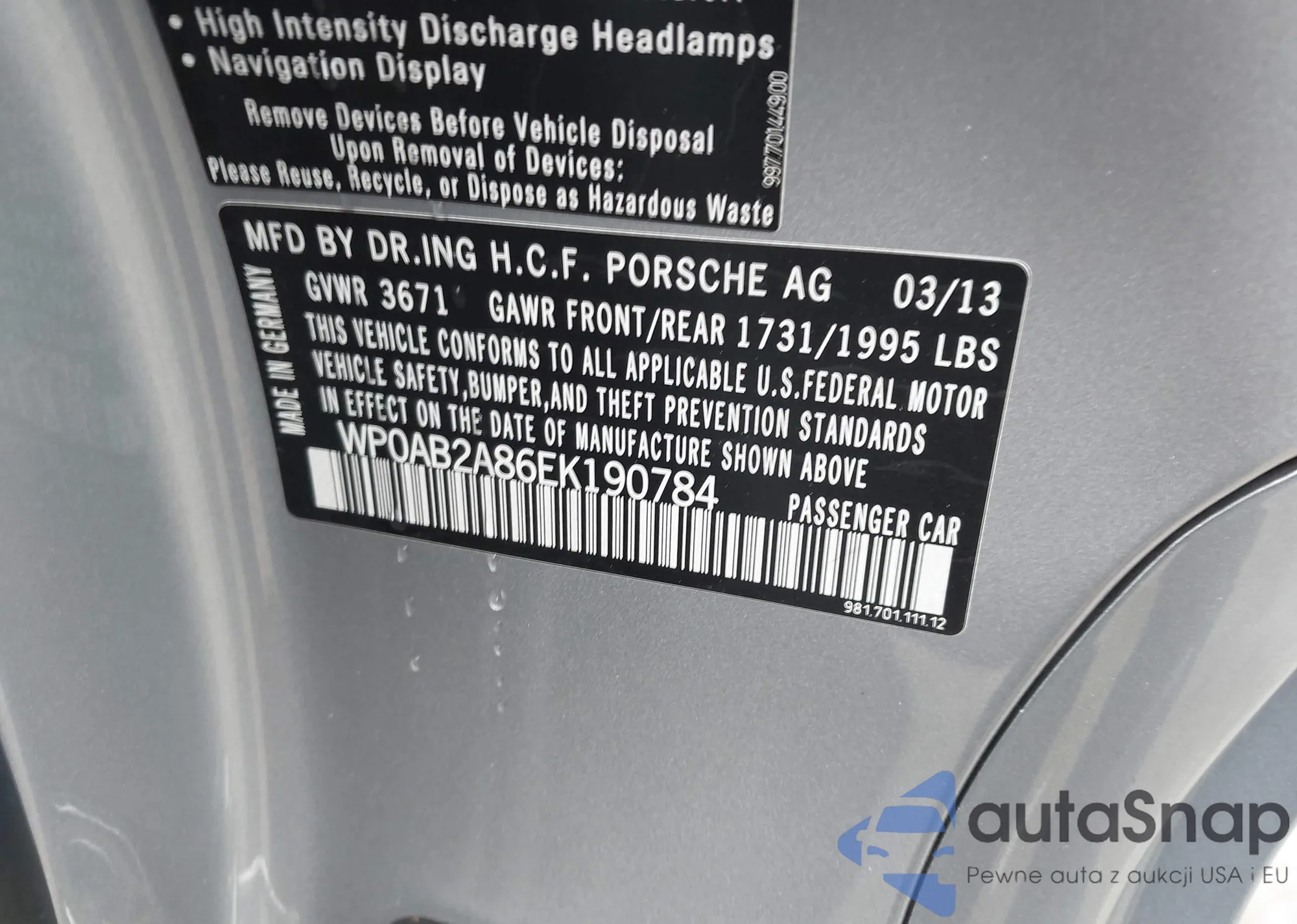 LOT: 44294559 VIN: WP0AB2A86EK190784