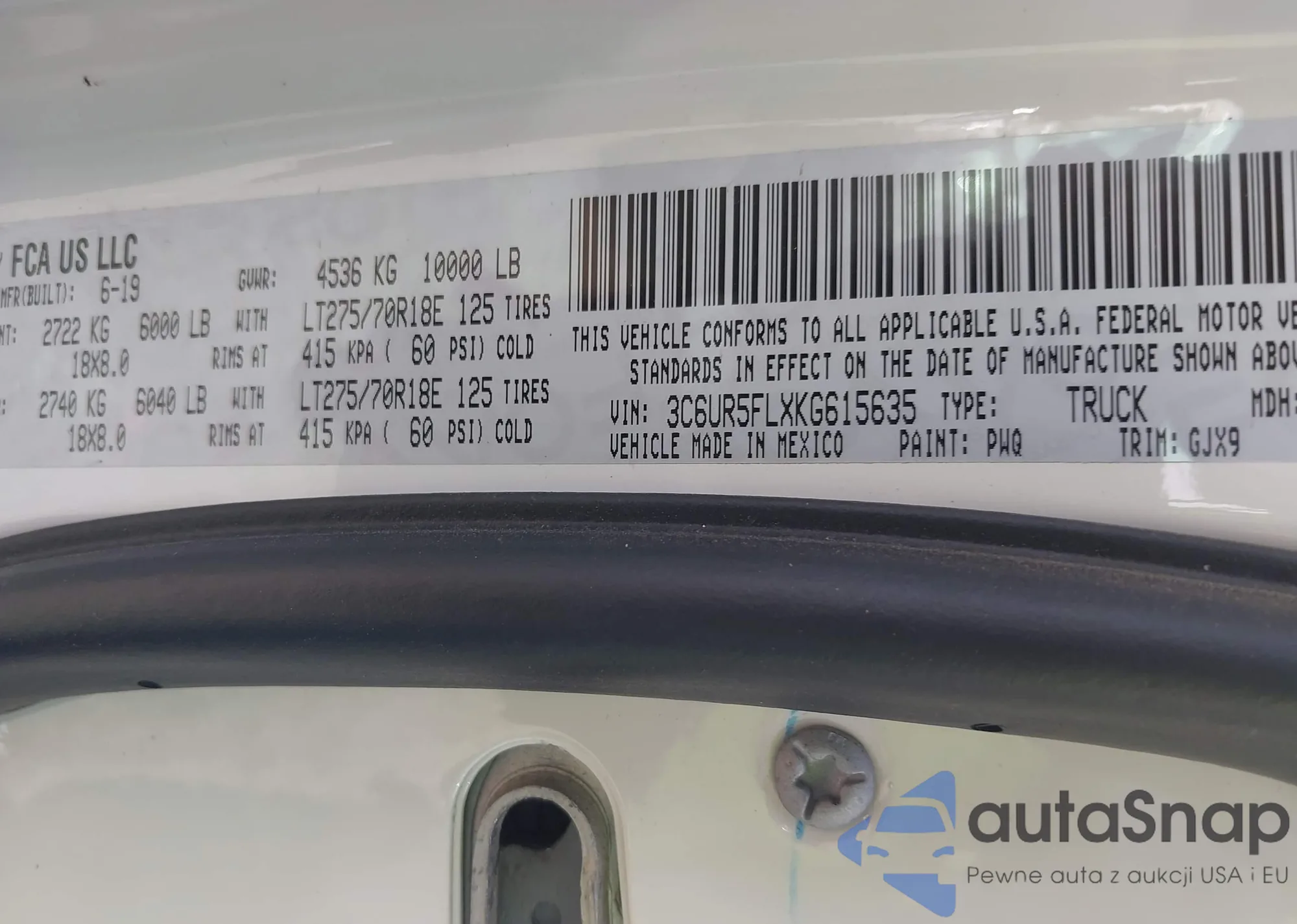 • VIN 3C6UR5FLXKG615635