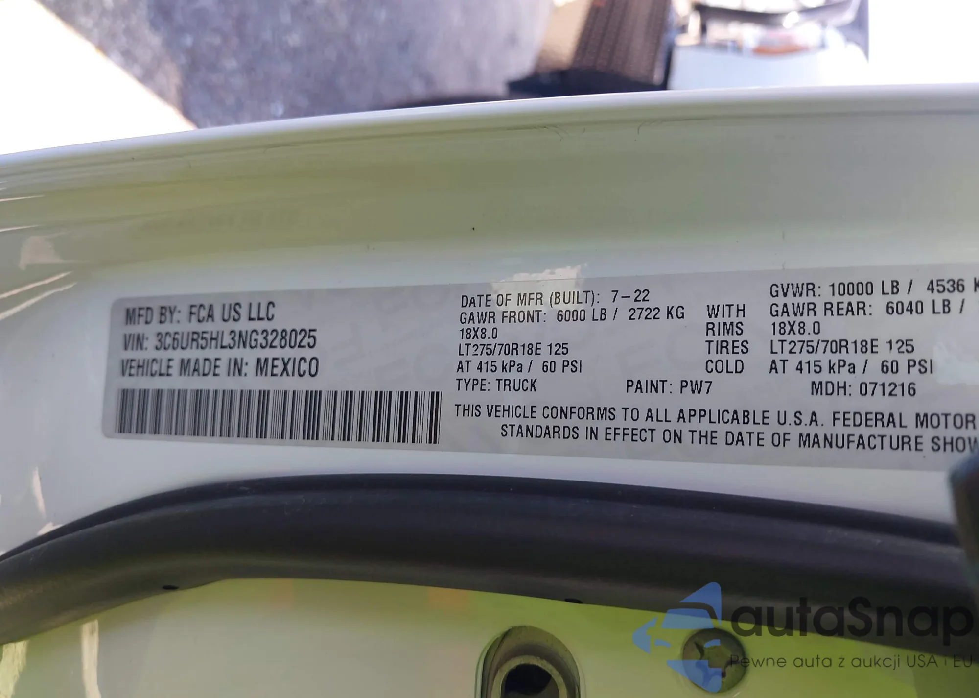 • VIN 3C6UR5HL3NG328025
