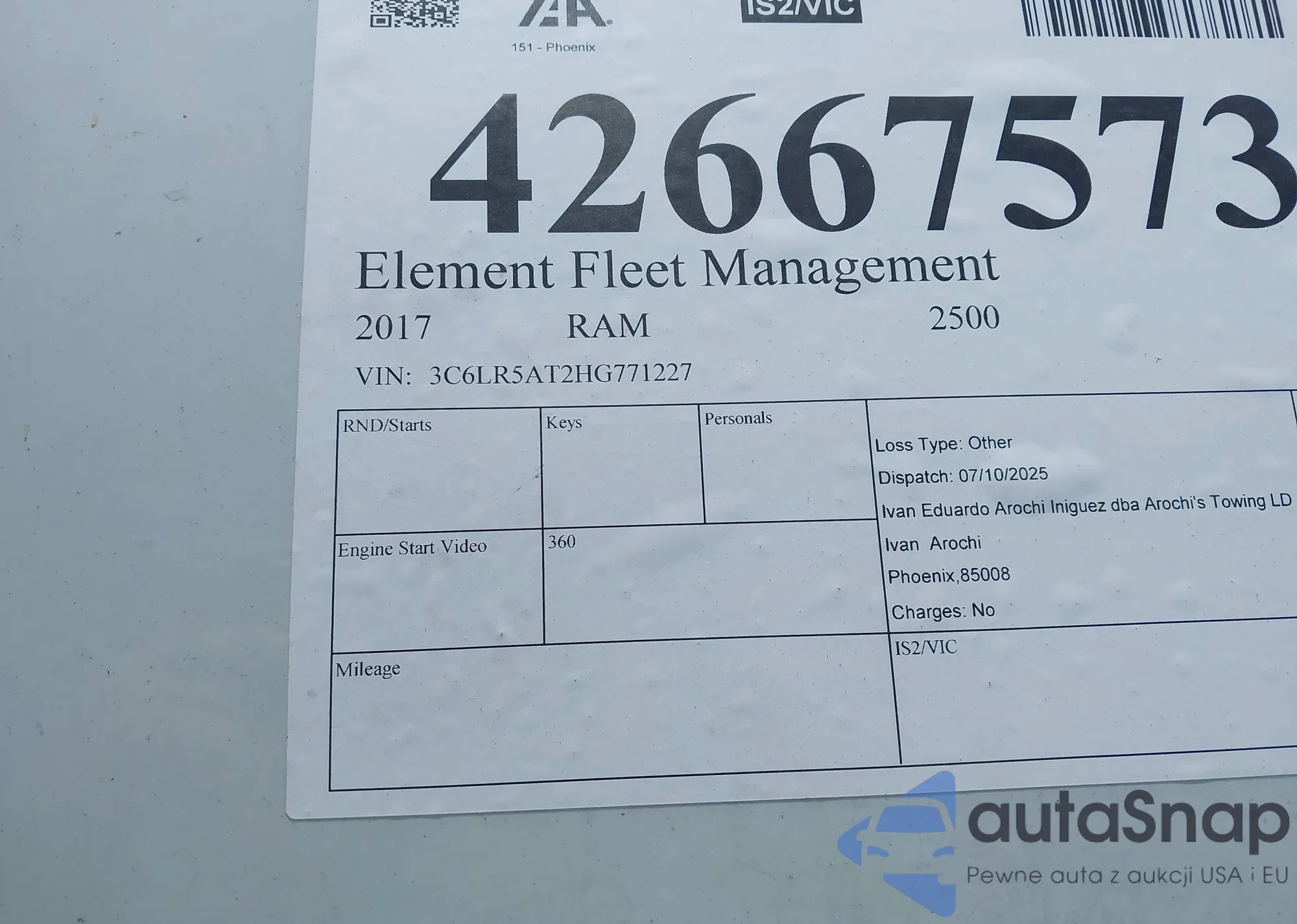 LOT: 42667573 VIN: 3C6LR5AT2HG771227