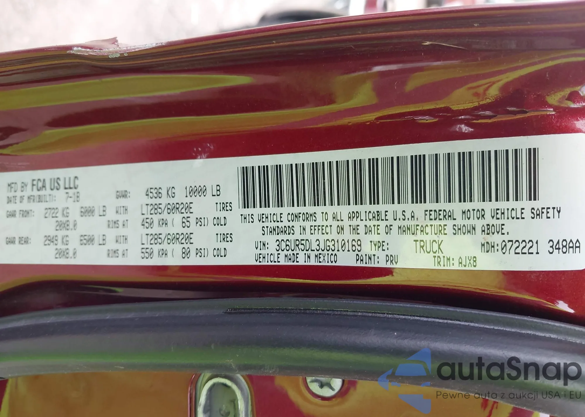 • VIN 3C6UR5DL3JG310169