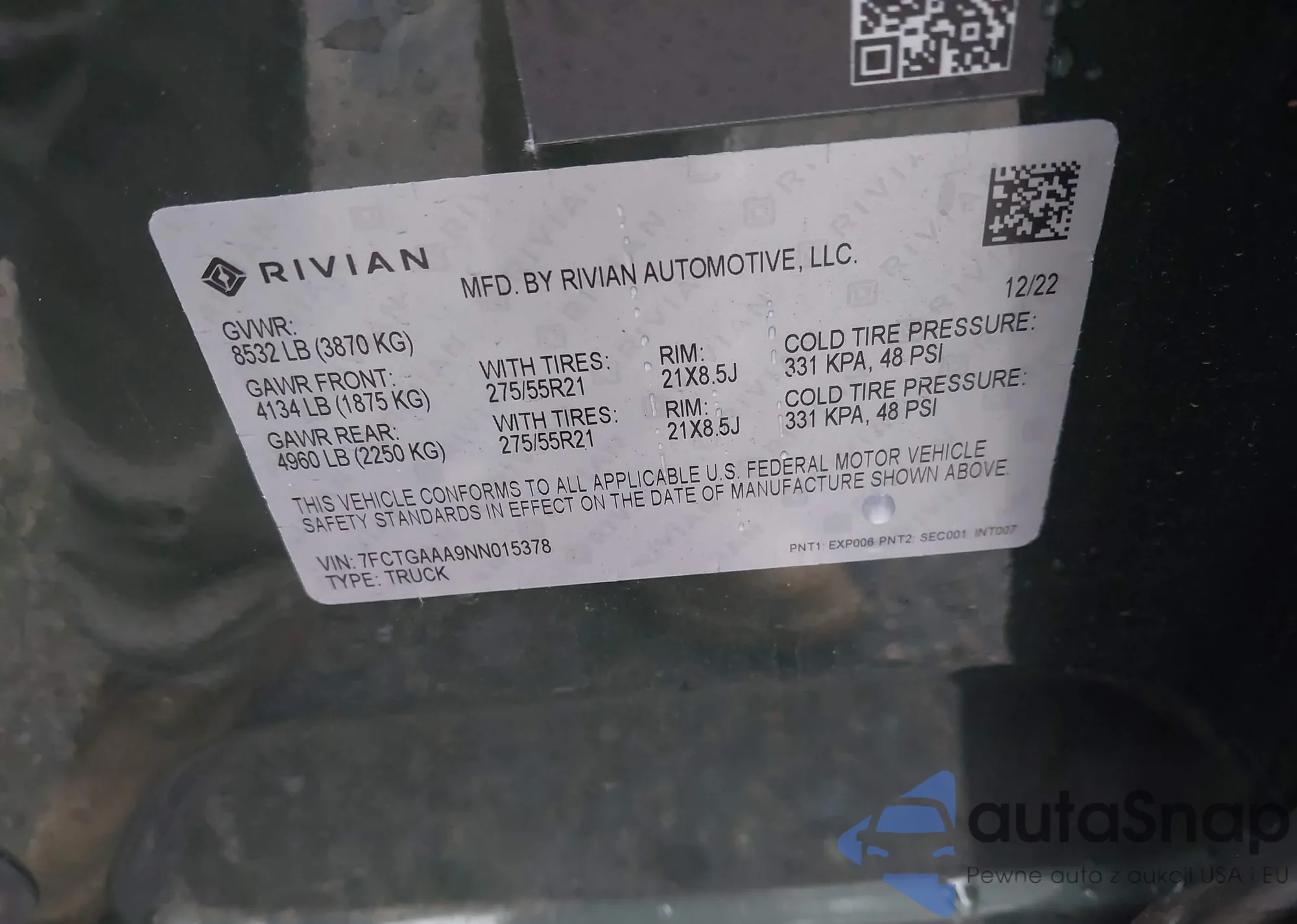 2022 Rivian R1T Adventure from USA, damaged, VIN 7FCTGAAA9NN015378