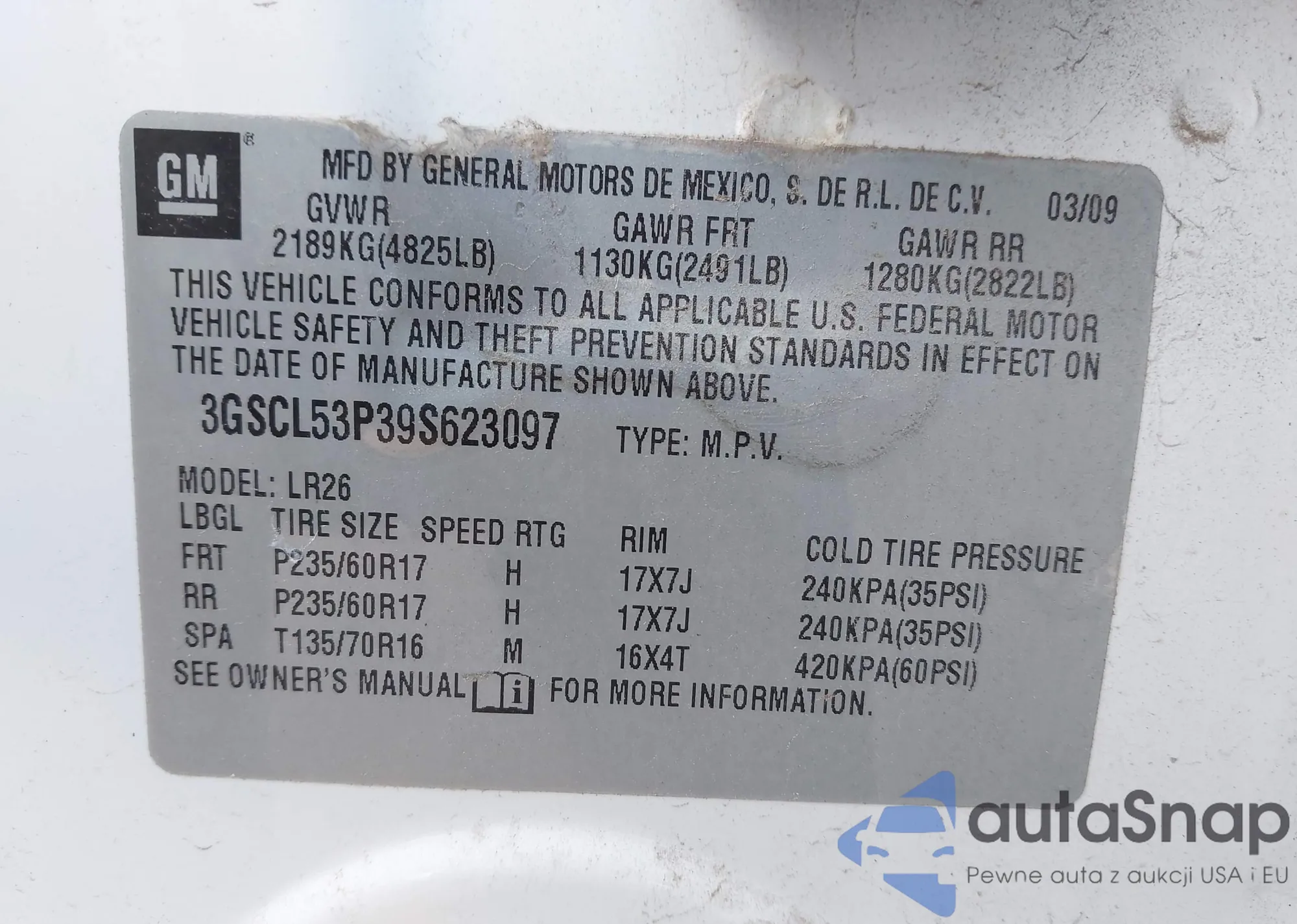 • VIN 3GSCL53P39S623097