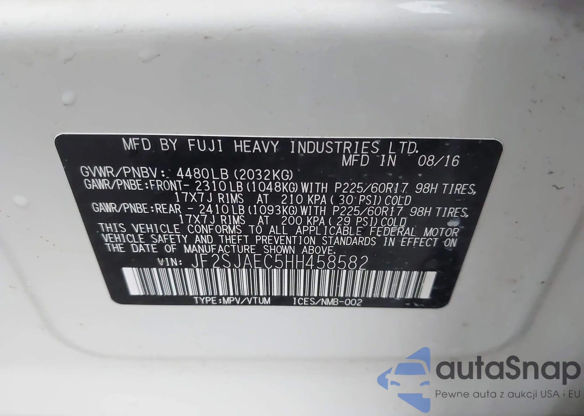 • VIN JF2SJAEC5HH458582