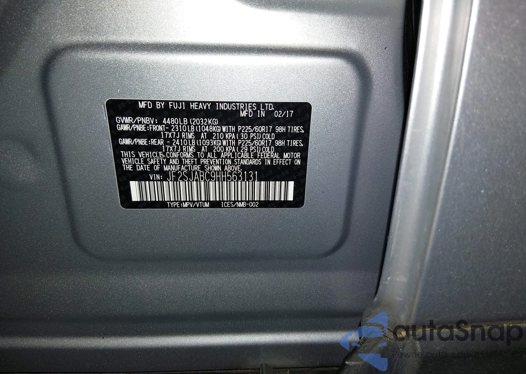 LOT: 44136680 VIN: JF2SJABC9HH563131