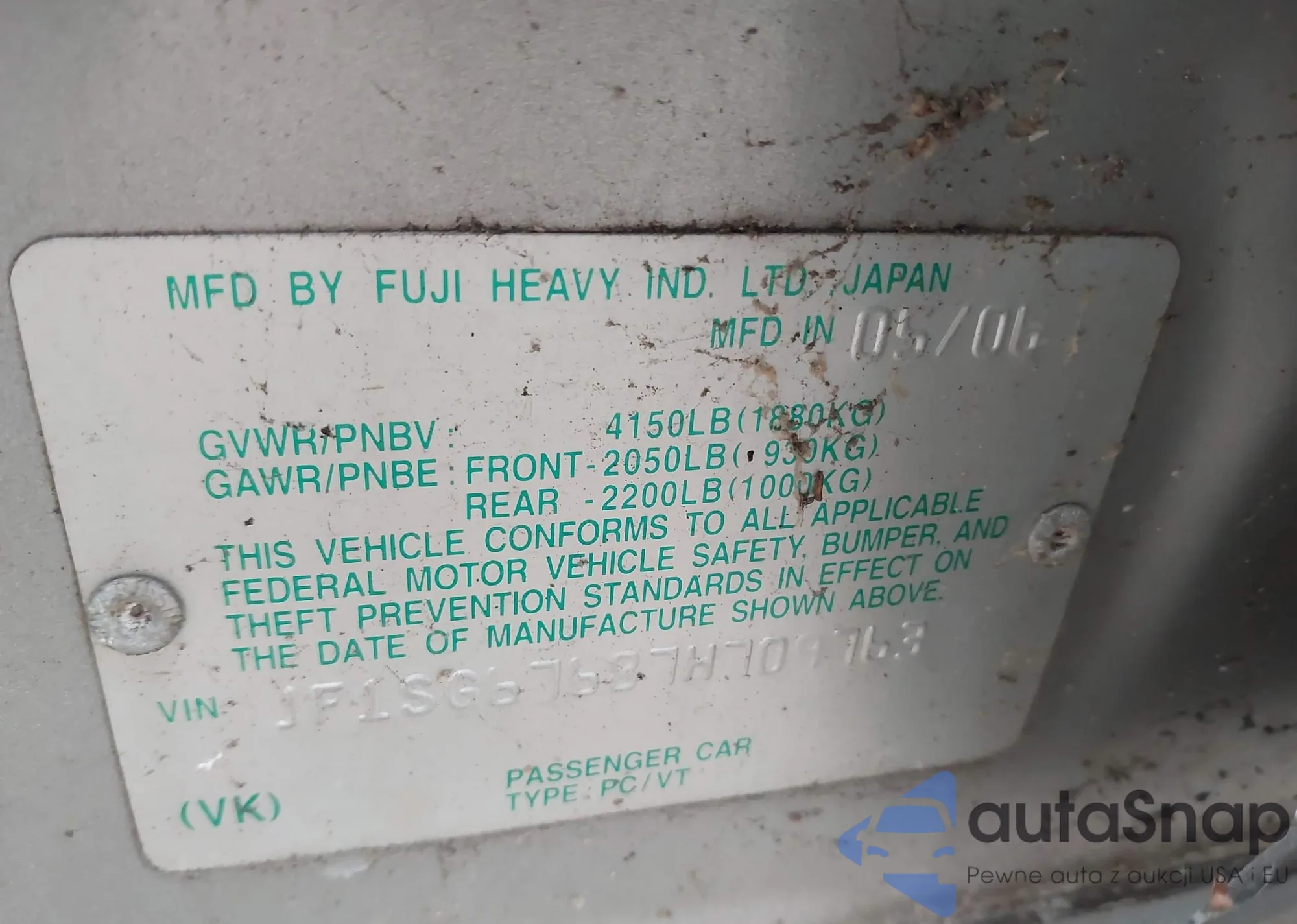 LOT: 41732459 VIN: JF1SG67687H709763