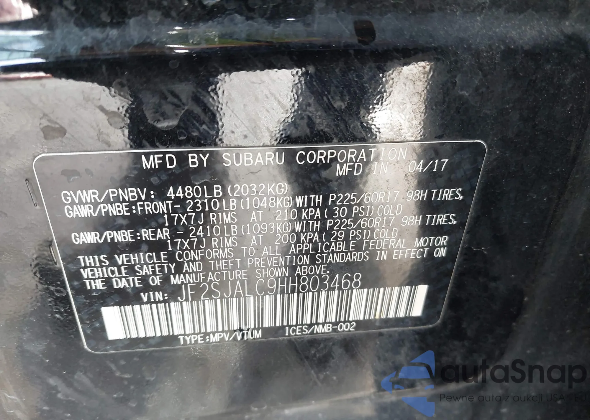 LOT: 43789665 VIN: JF2SJALC9HH803468