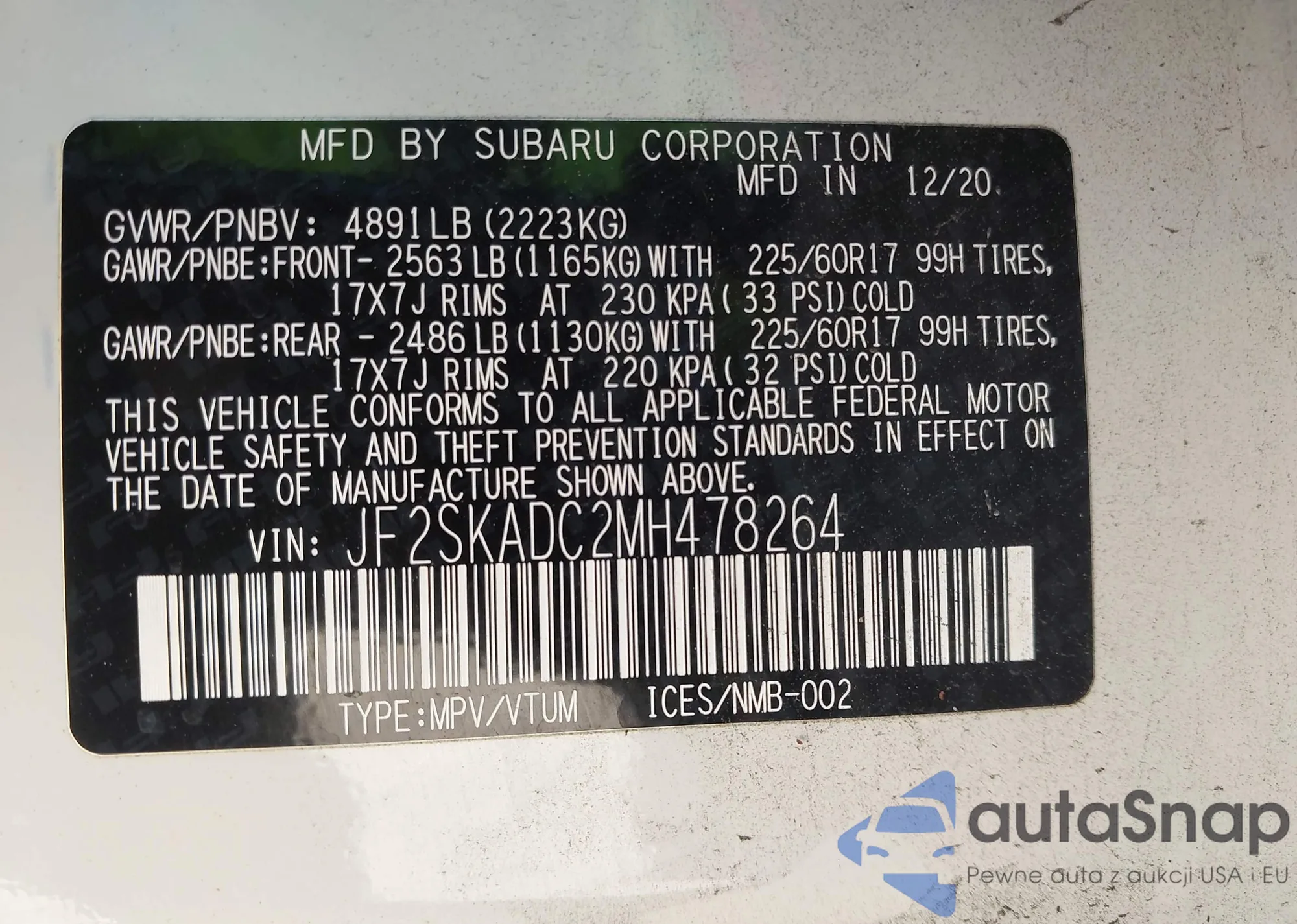 LOT: 43928141 VIN: JF2SKADC2MH478264