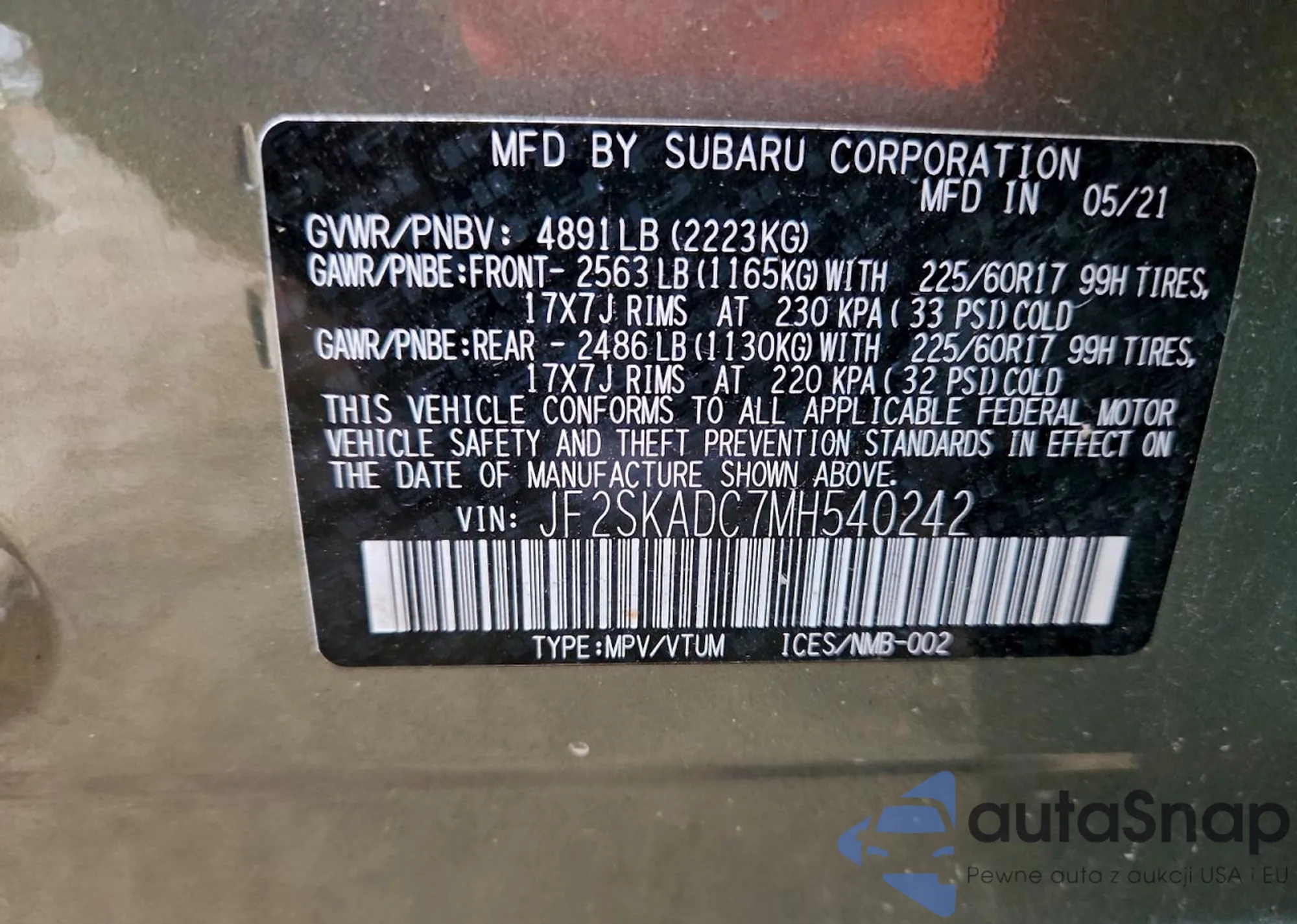 LOT: 99274485 VIN: JF2SKAJC3MH493053