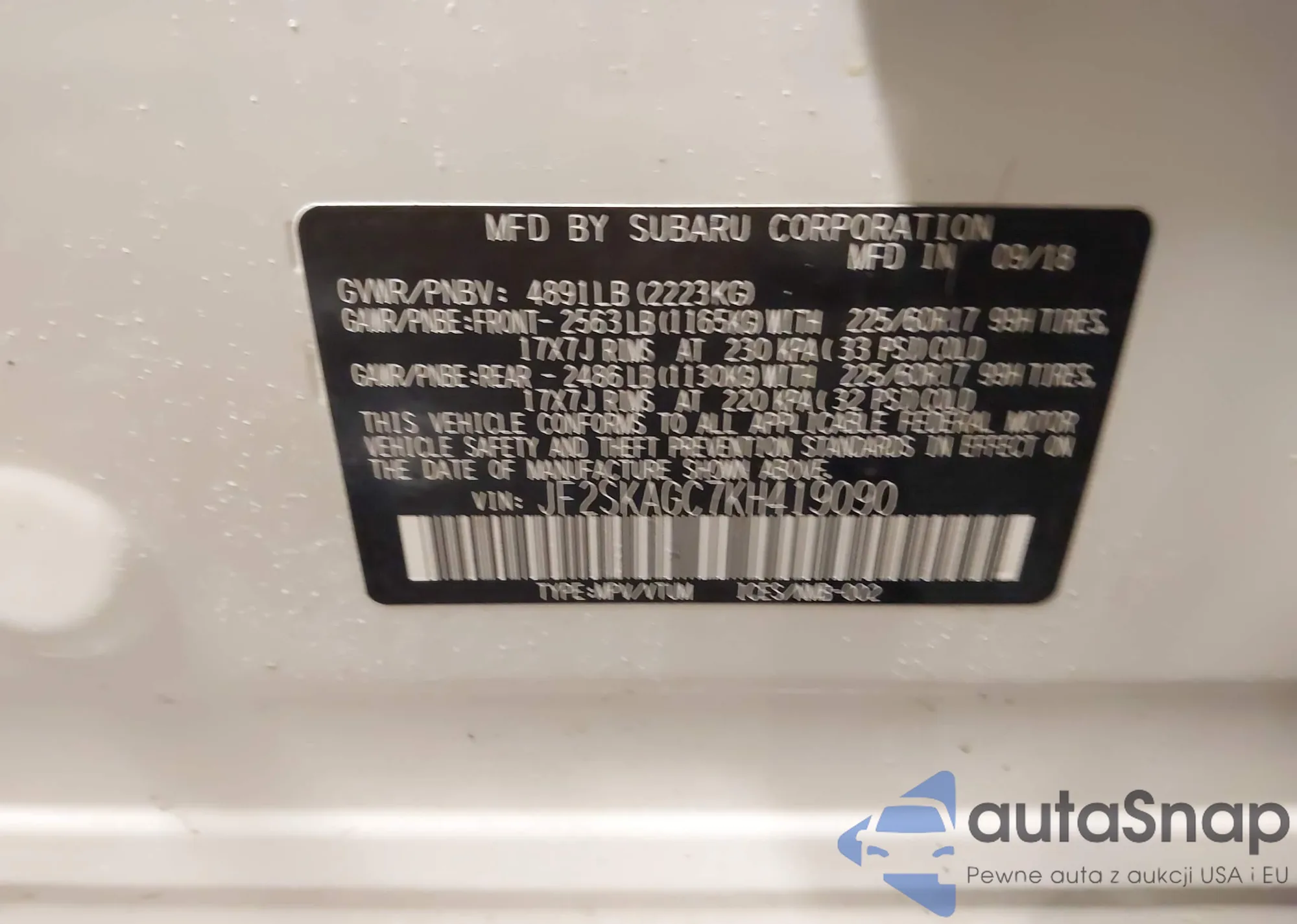 • VIN JF2SKAGC7KH419090