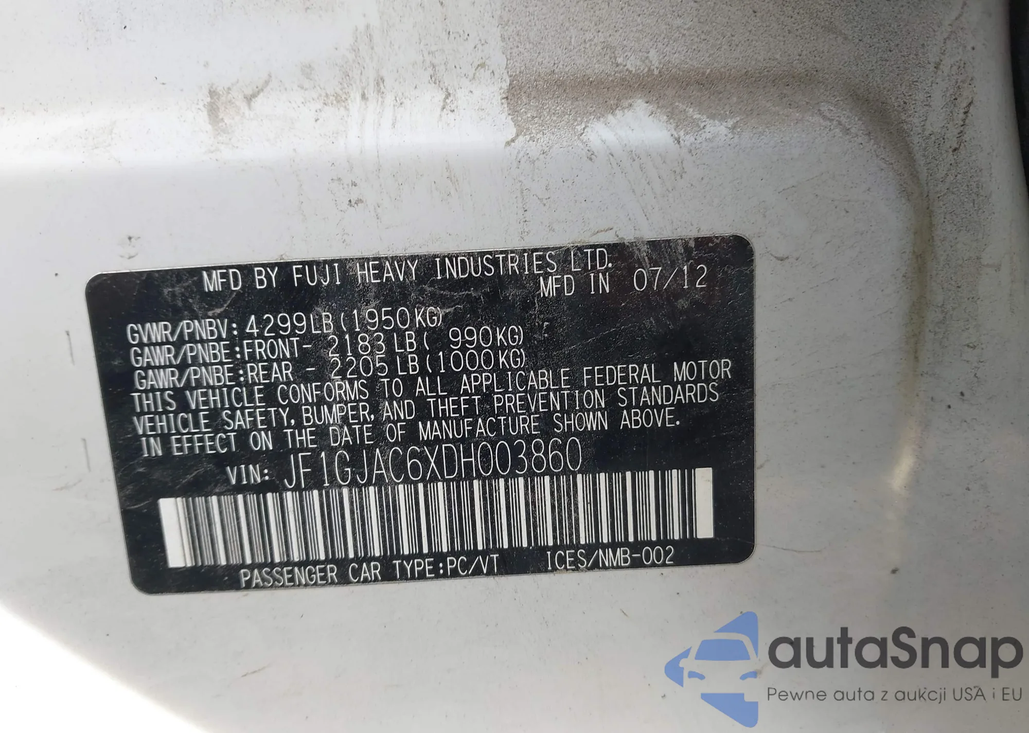 LOT: 44139342 VIN: JF1GJAC6XDH003860