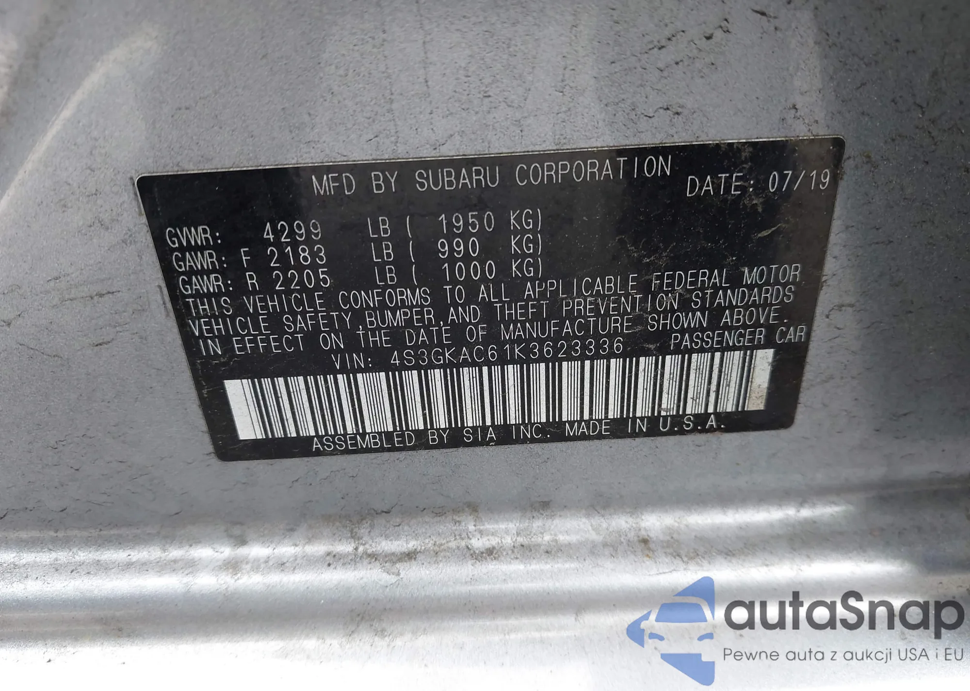 • VIN 4S3GKAC61K3623336