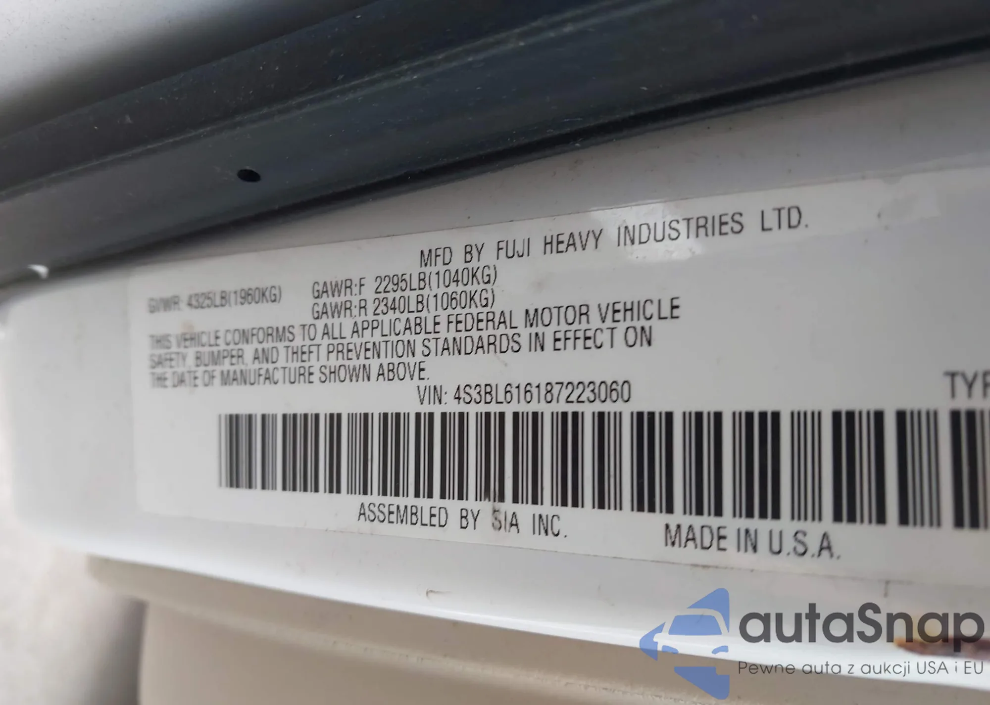 LOT: 44059098 VIN: 4S3BL616187223060