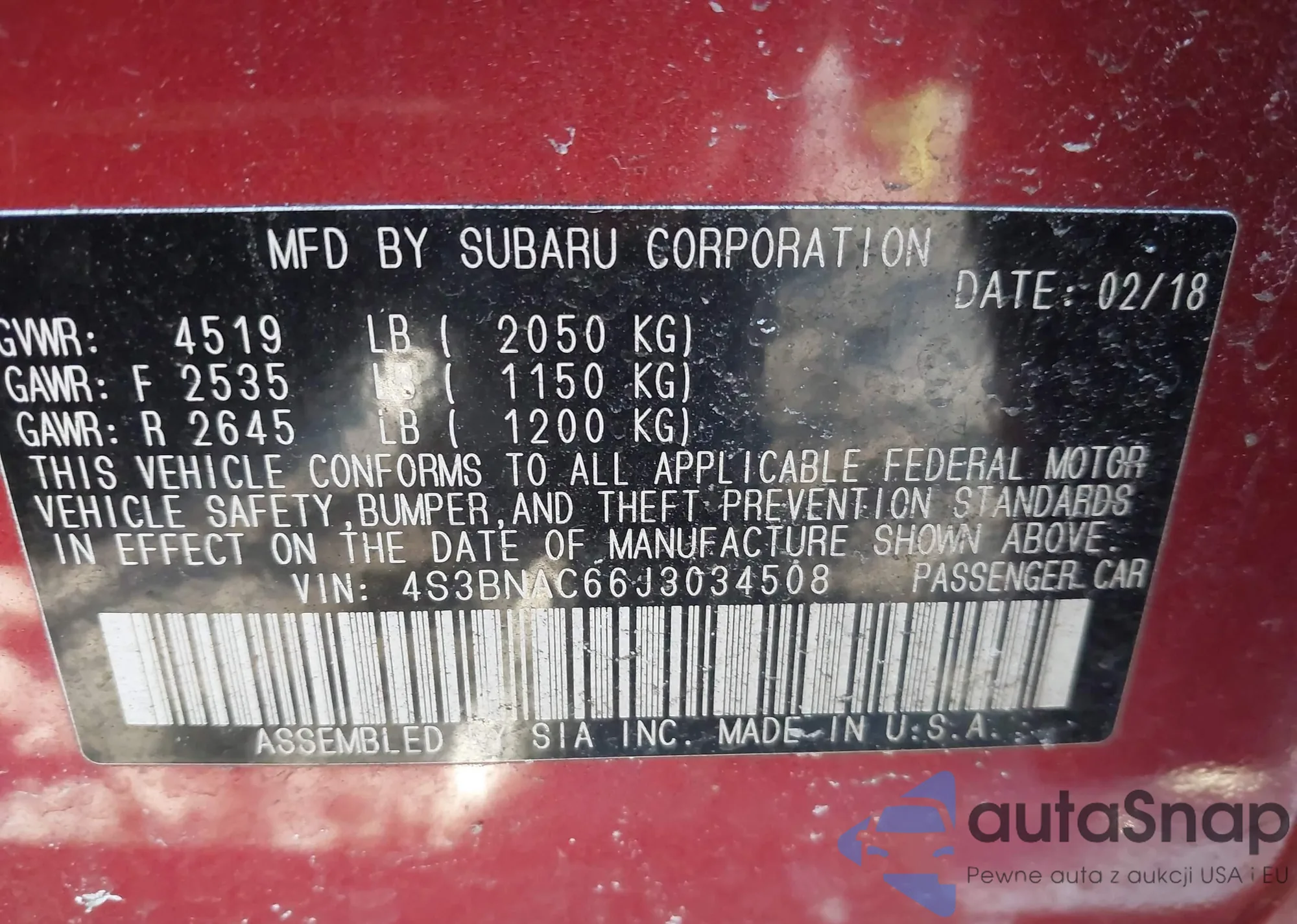 • VIN 4S3BNAC66J3034508