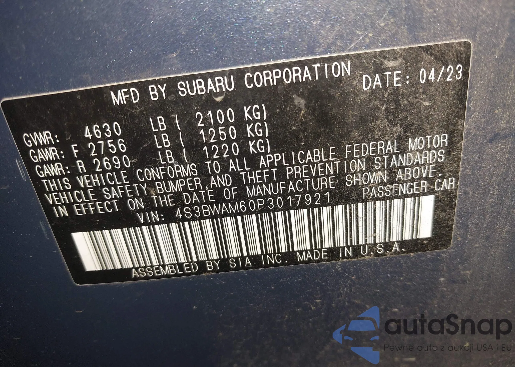 • VIN 4S3BWAM60P3017921