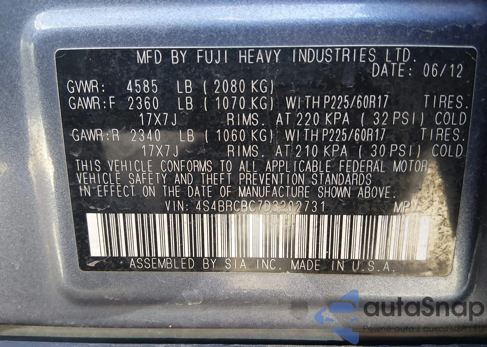 LOT: 44561007 VIN: 4S4BRCBC7D3202731