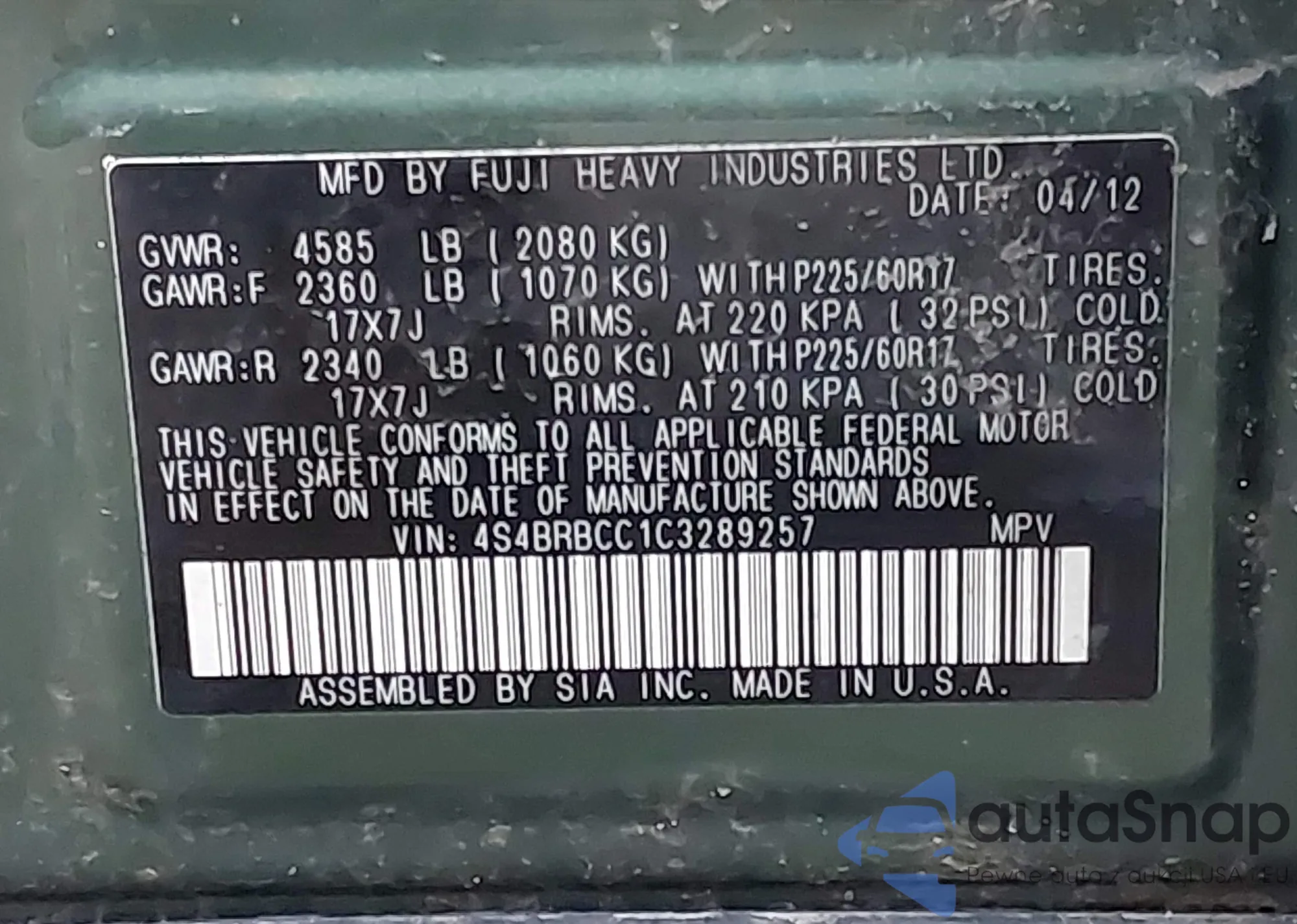 LOT: 43973219 VIN: 4S4BRBCC1C3289257