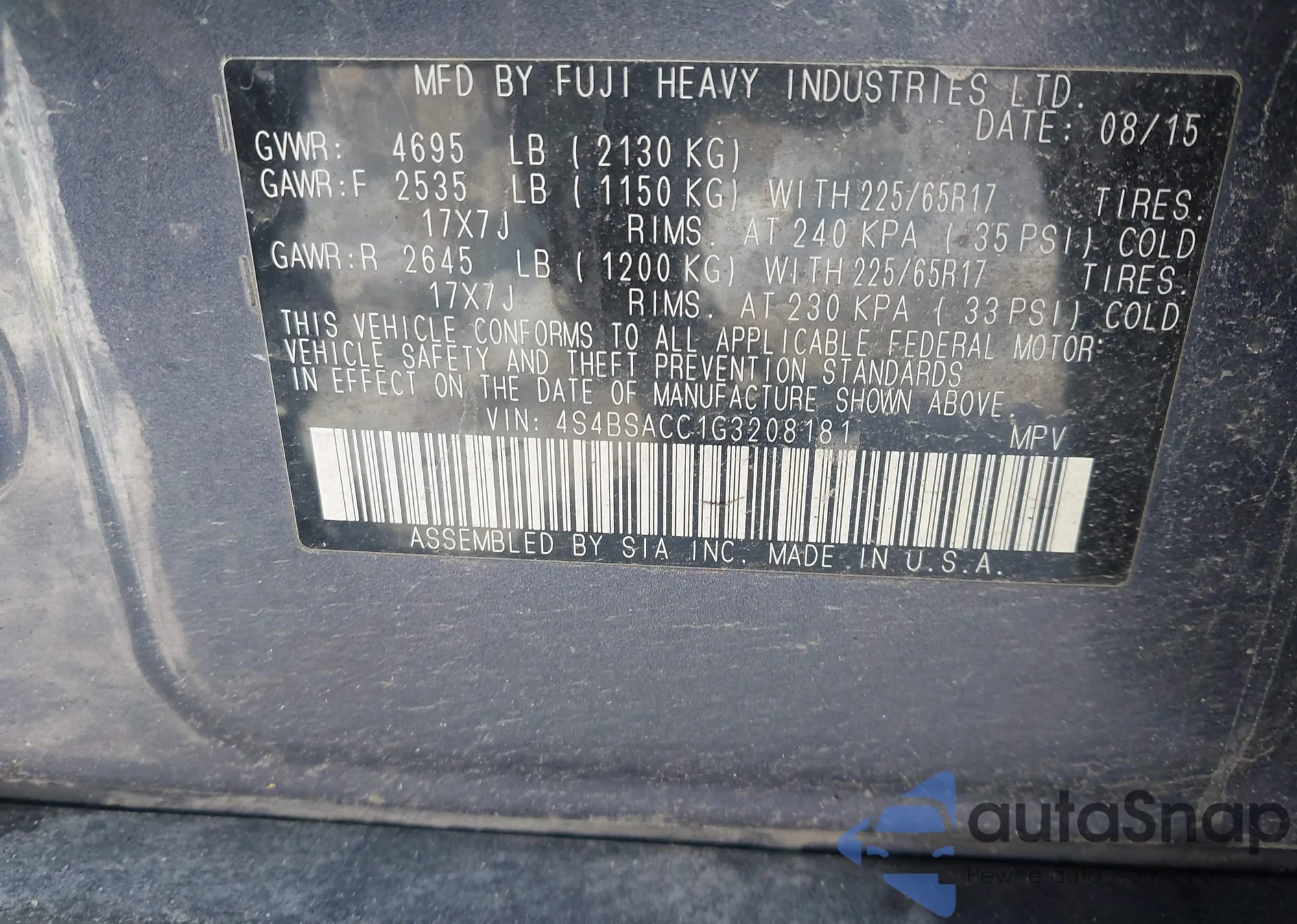 LOT: 43983908 VIN: 4S4BSBNC4F3261569