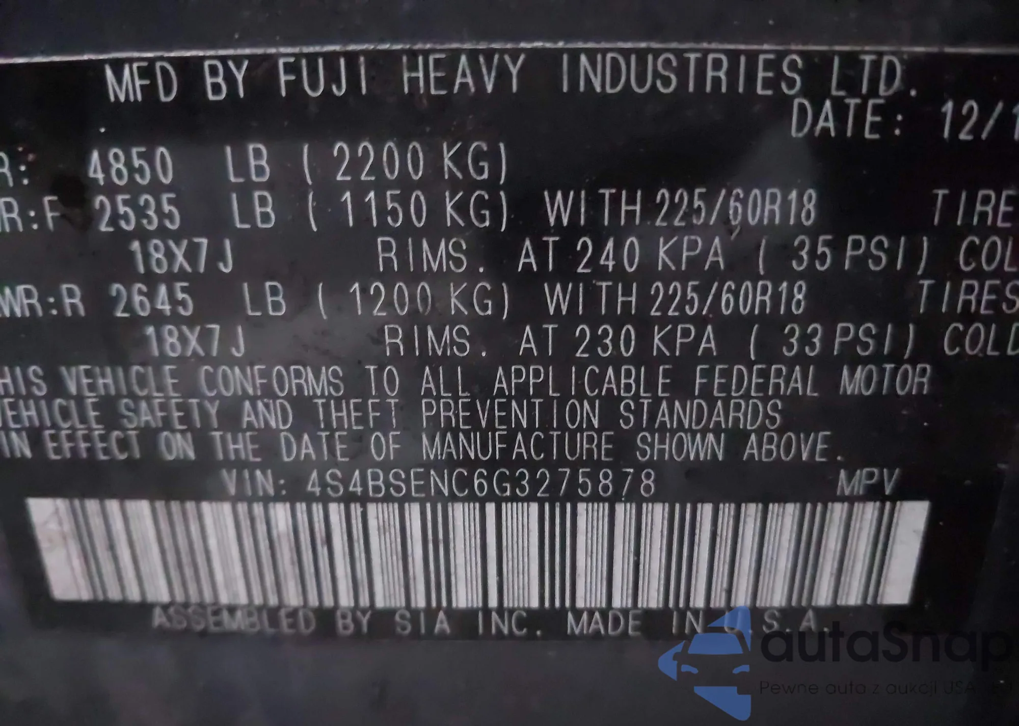 LOT: 43888002 VIN: 4S4BSENC6G3275878