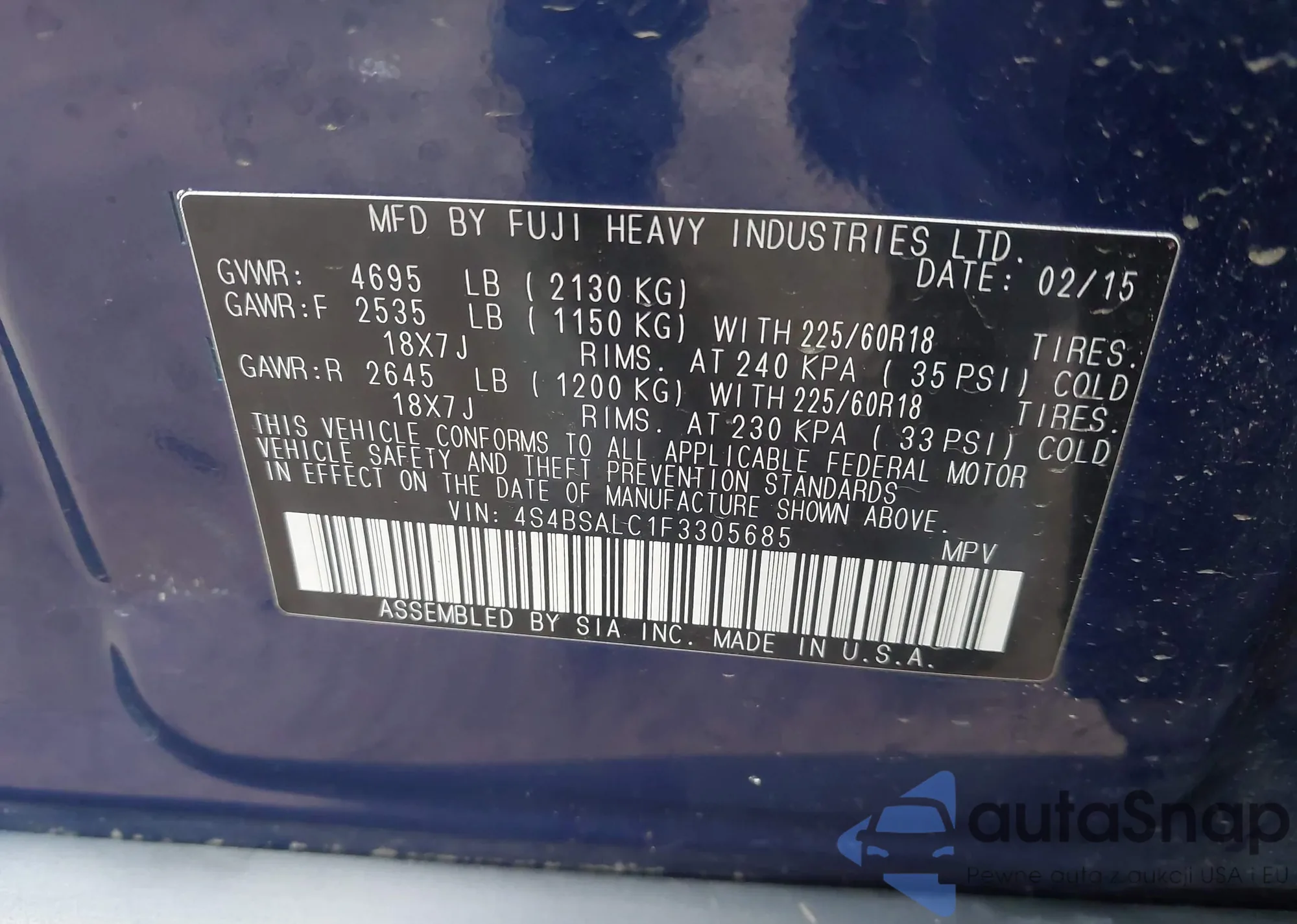 LOT: 44025917 VIN: 4S4BSALC1F3305685