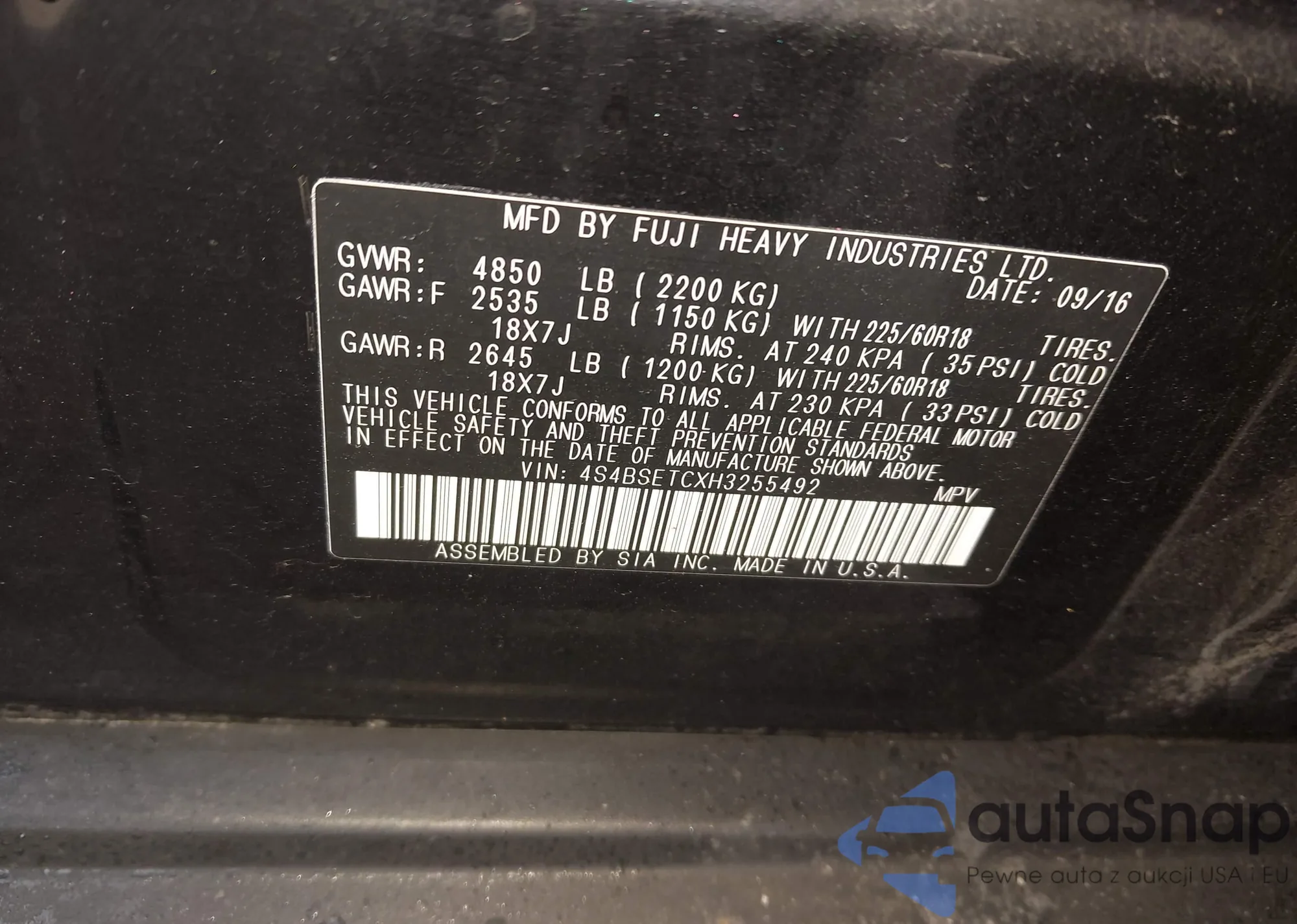 • VIN 4S4BSAFC3J3249897