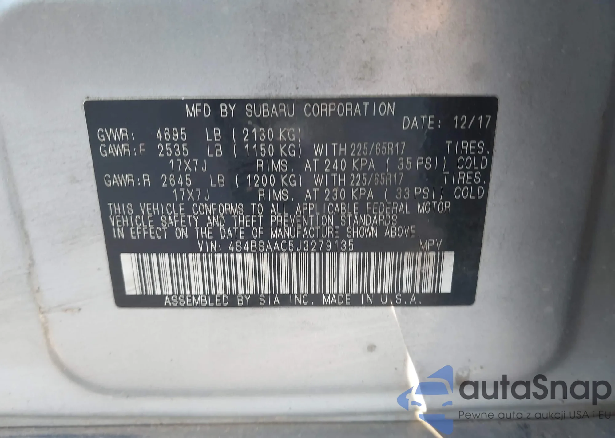 • VIN 4S4BSAAC5J3279135