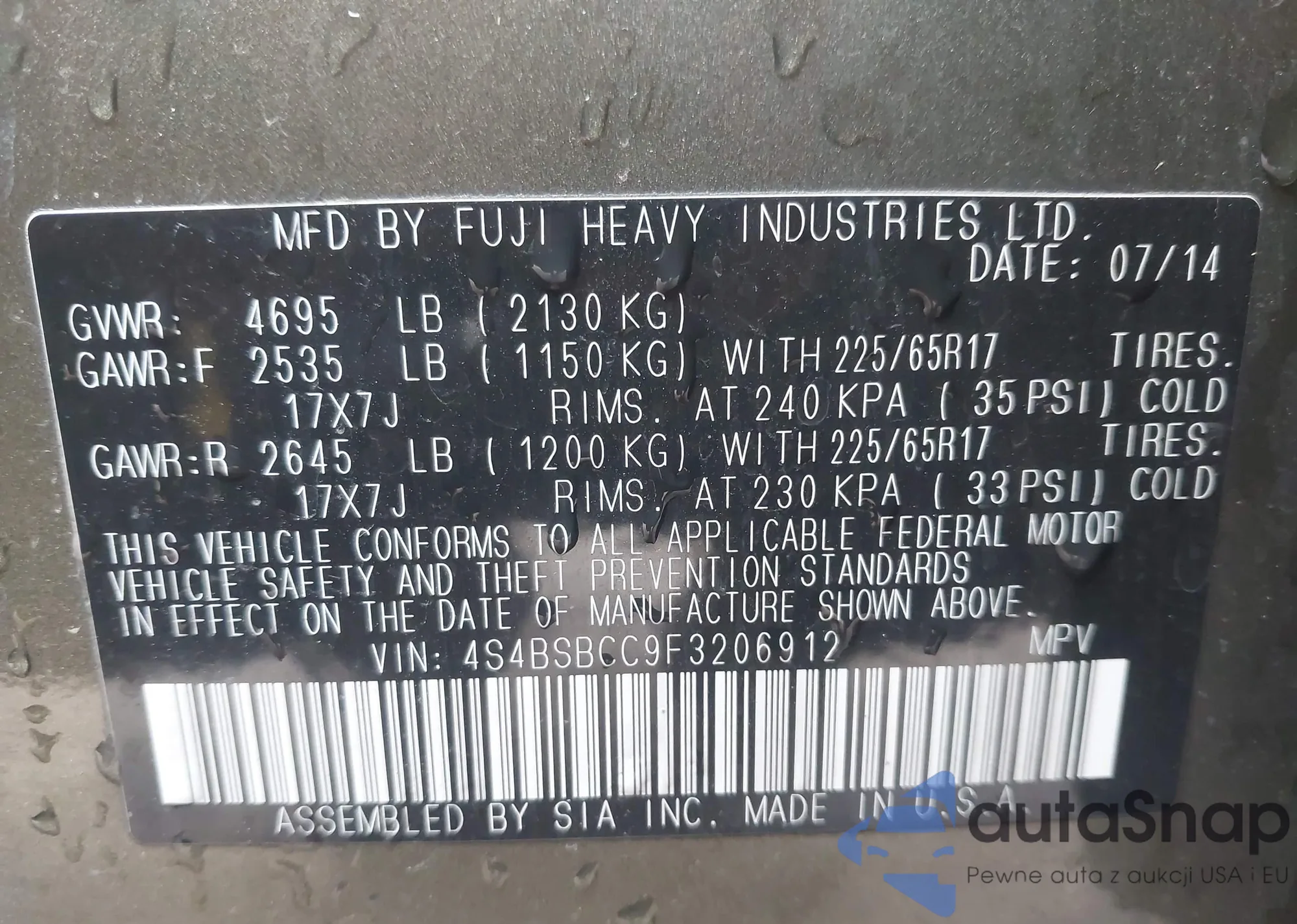 • VIN 4S4BSBCC9F3206912